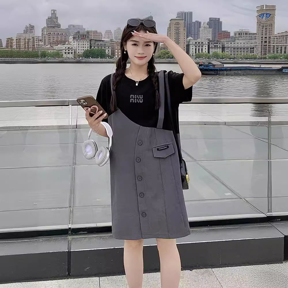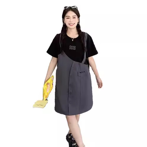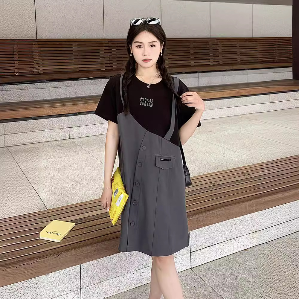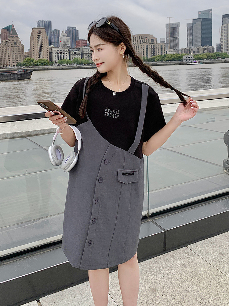 夏新款懒人洋气圆领拼接假两件连衣裙时髦少女感休闲气质中裙