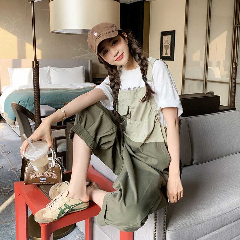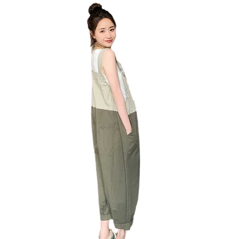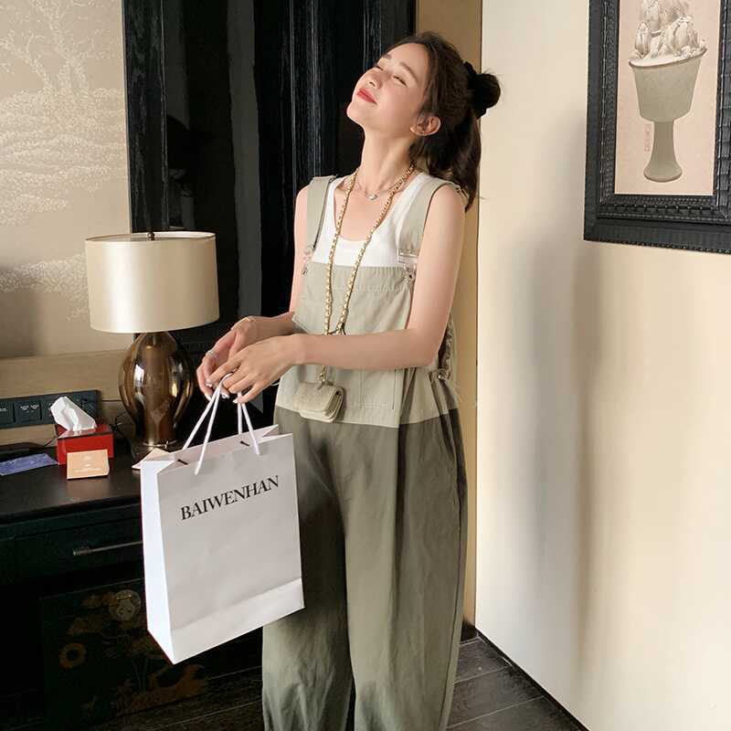 懒人撞色拼接调节肩带抽绳收腰背带裤设计感休闲减龄工服连体裤女