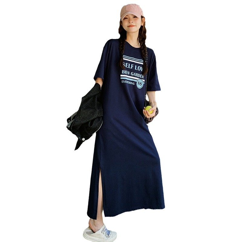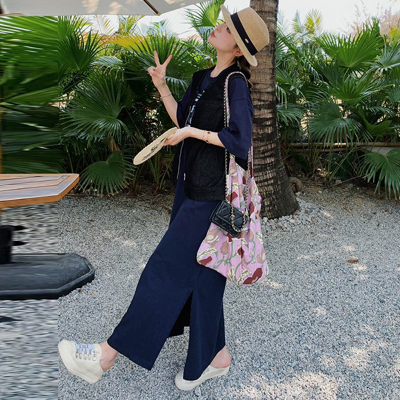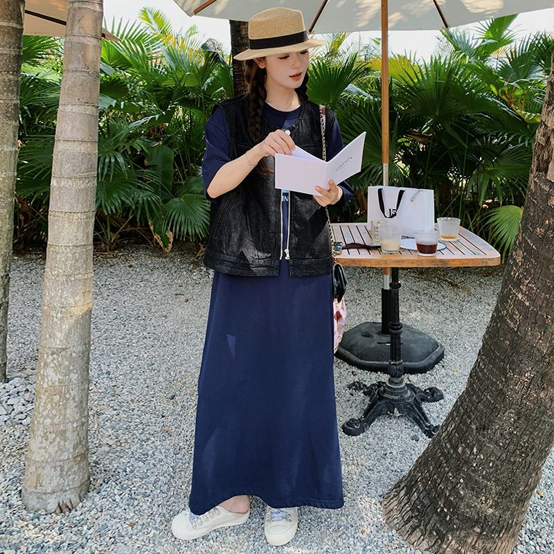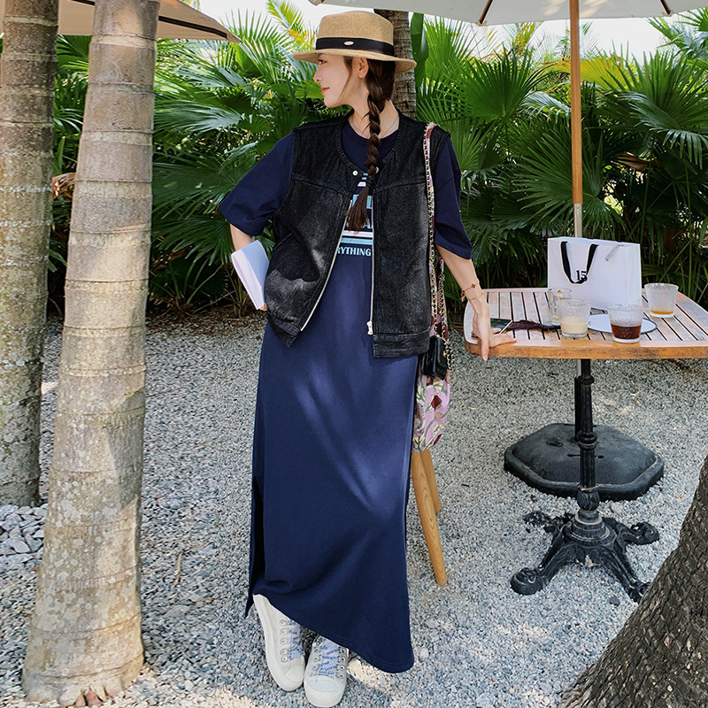 夏新品薄款牛仔马甲T恤字母印花开叉连衣裙女两件套休闲套装