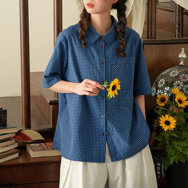 复古蓝色格子衬衫女夏季薄款日系休闲上衣翻领衬衣