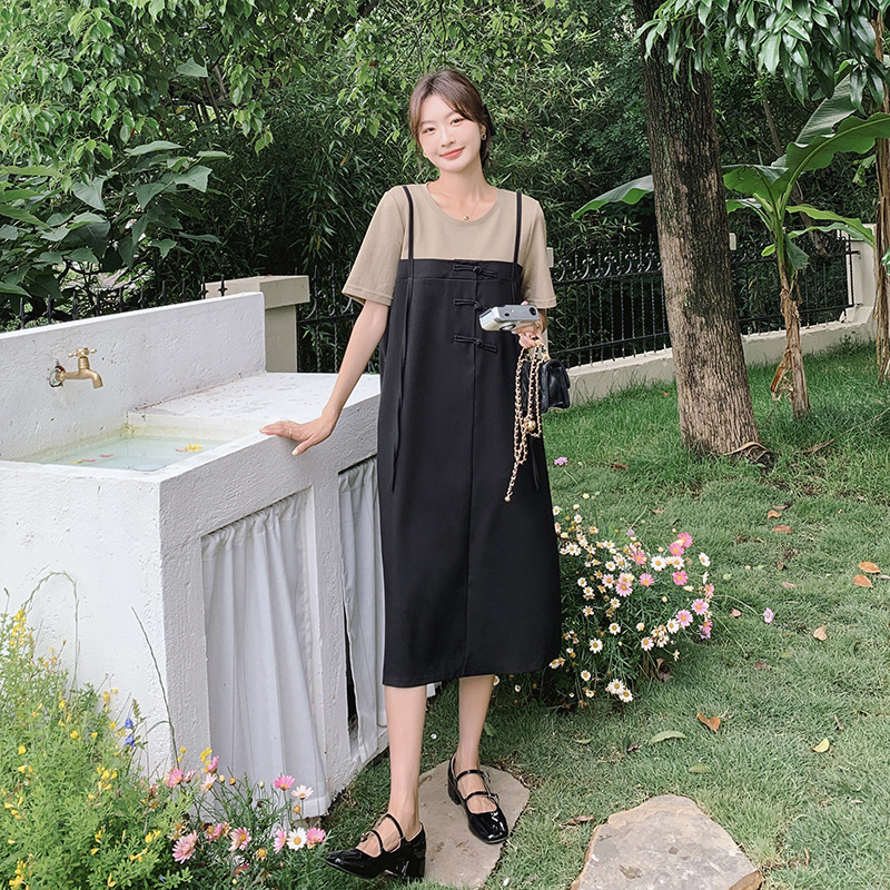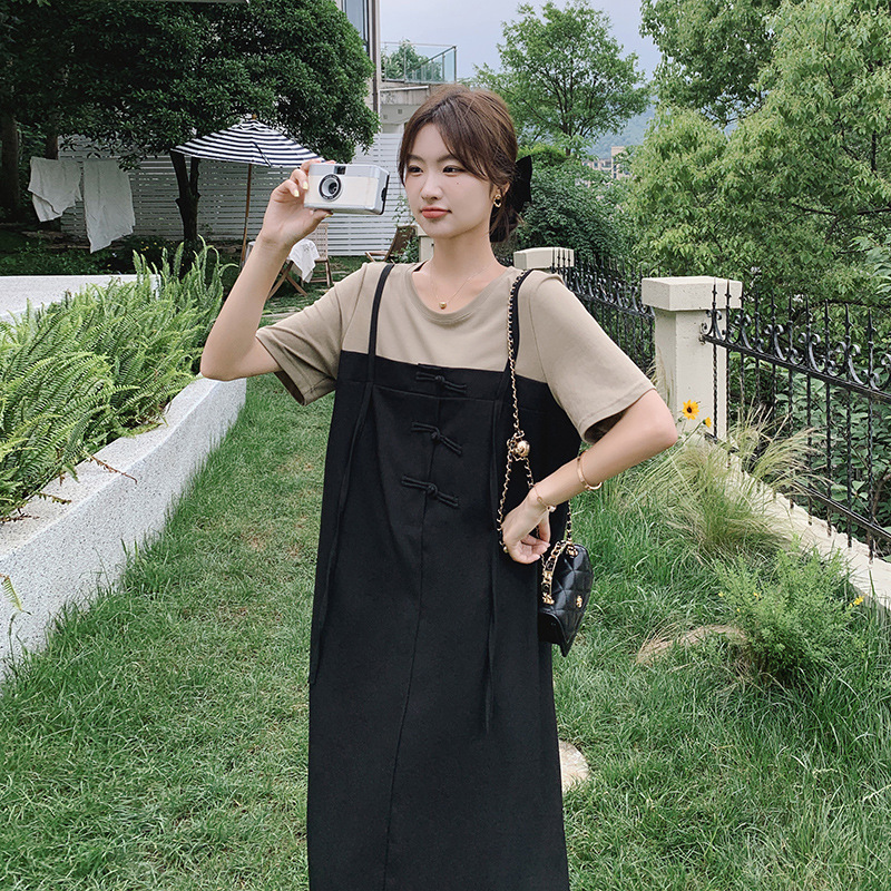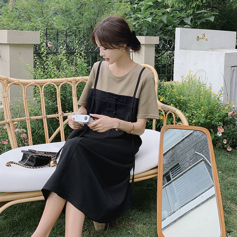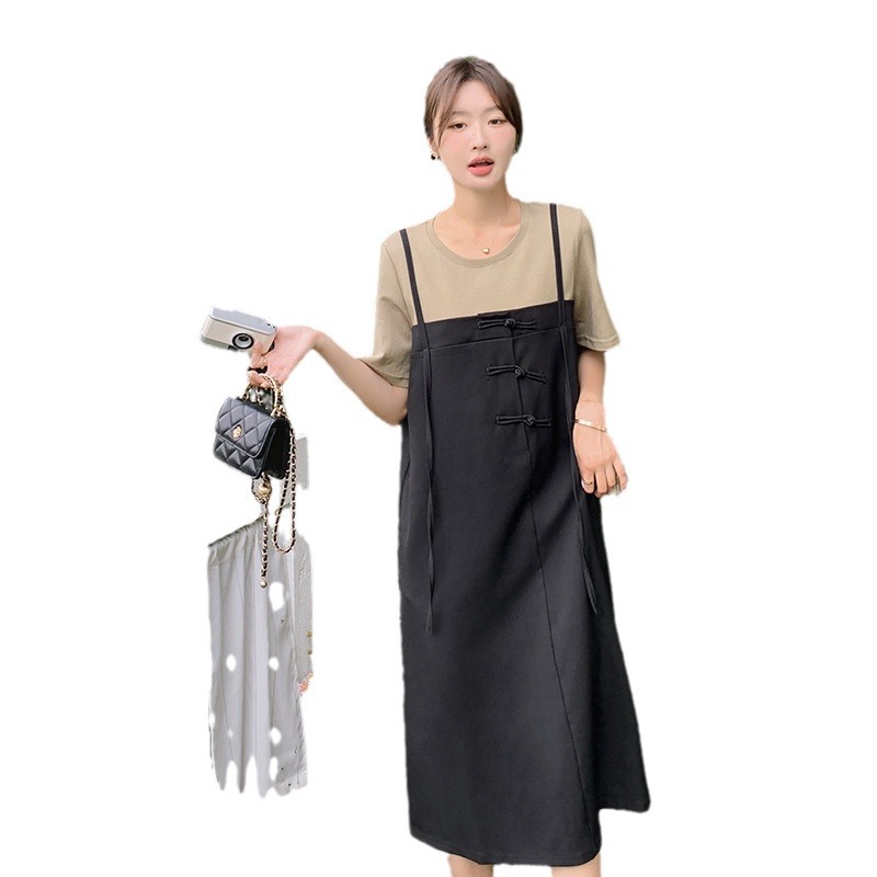 法式温柔风夏新款撞色圆领盘扣拼接假两件连衣裙高级感气质休闲裙