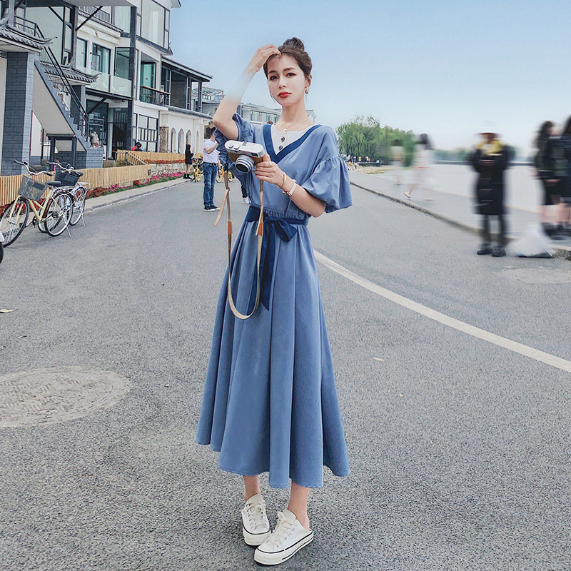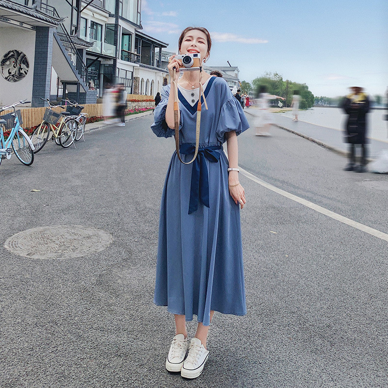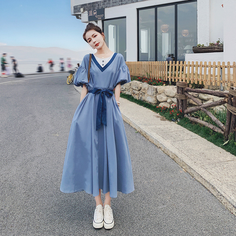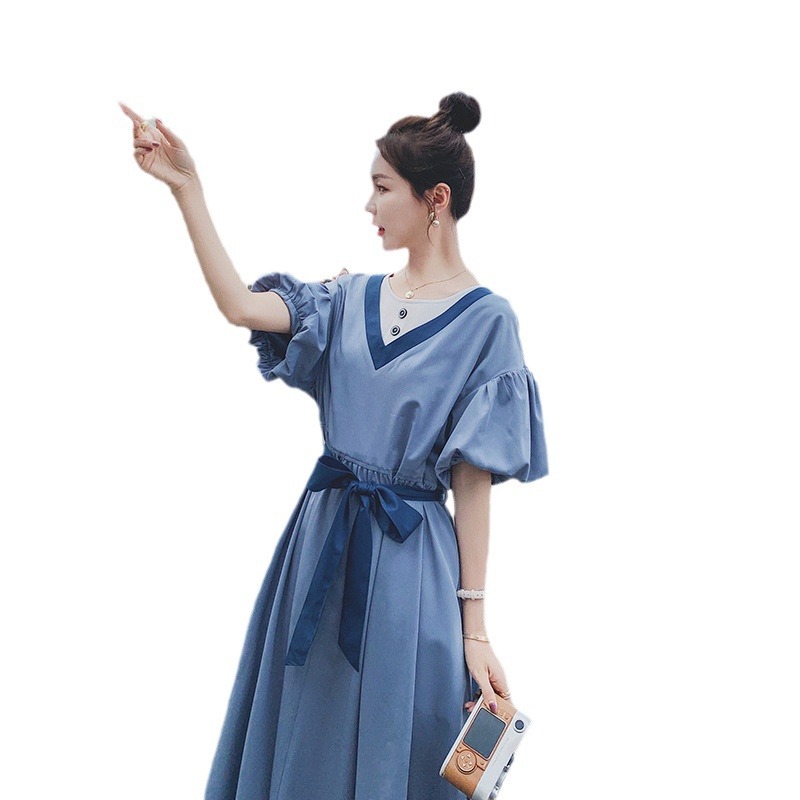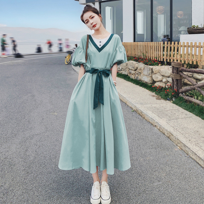 时尚潮流撞色拼接圆领落肩灯笼袖大裙摆高腰束带气质休闲连衣裙夏