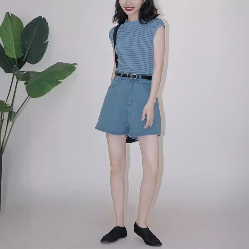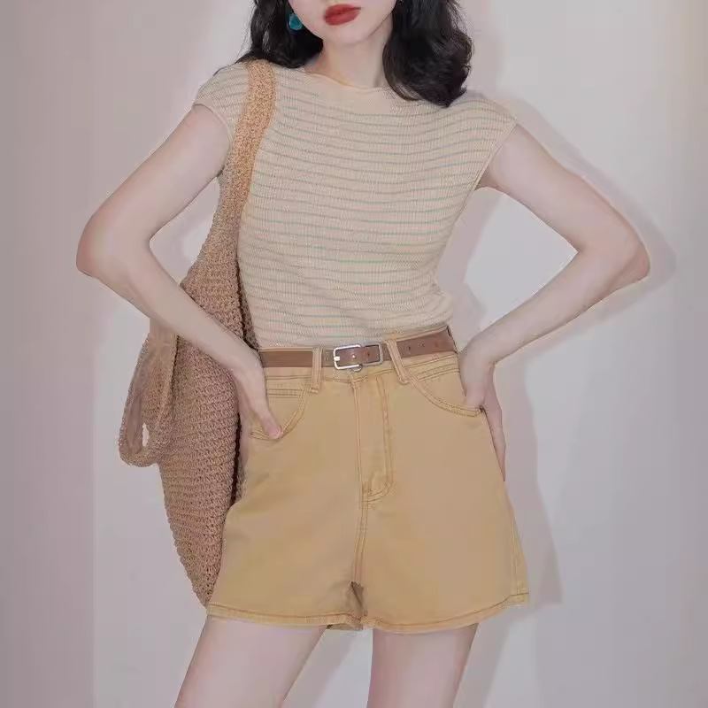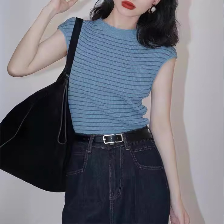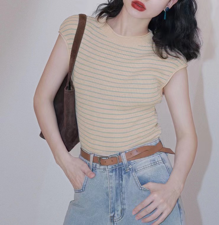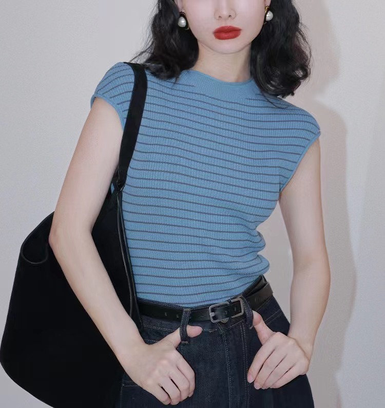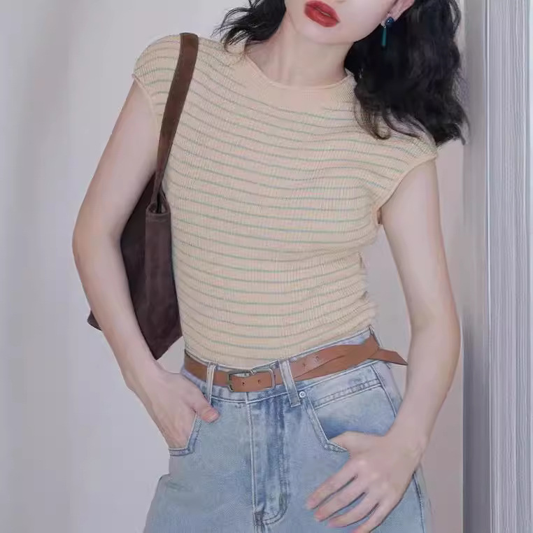 法式港风条纹冰丝针织T恤女夏圆领短袖打底衫高级感外穿上衣薄款