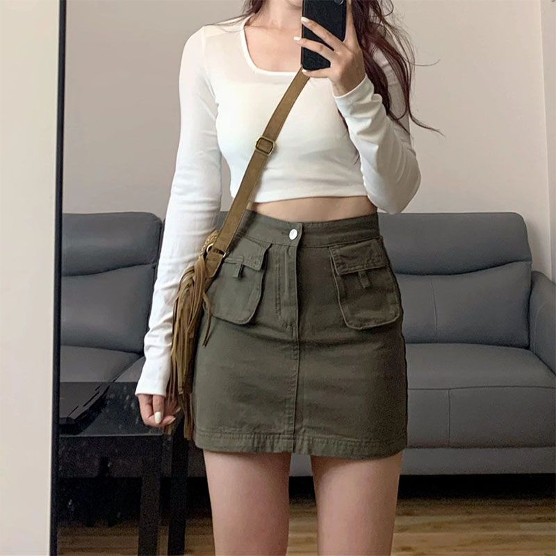 灰绿色高腰牛仔工装裙女装防走光小个子新款遮胯包臀短裙子