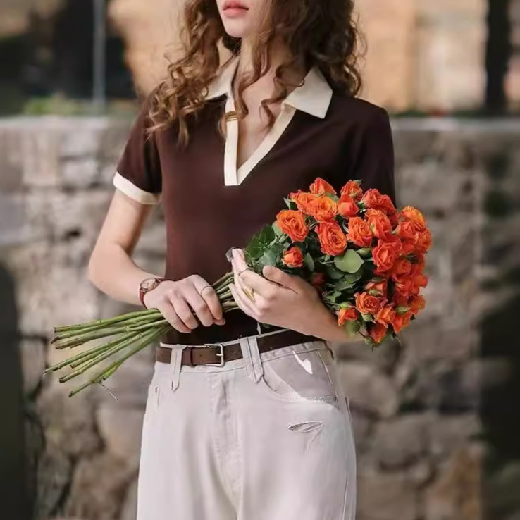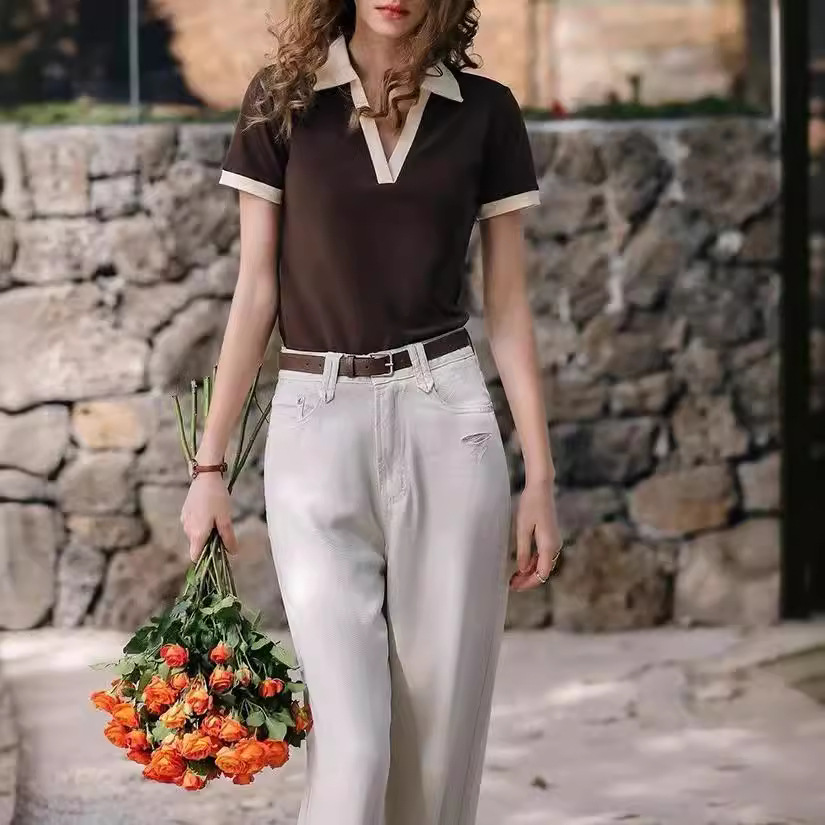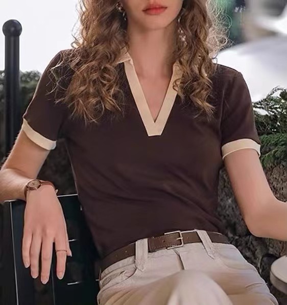 法式撞色拼接气质polo衫T恤女夏新款正肩翻领短袖V领通勤上衣
