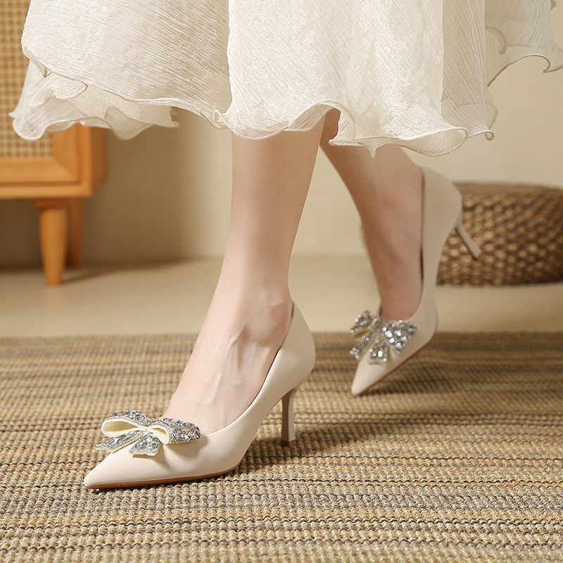 新款水钻婚鞋女浅色细跟高跟鞋黑色单鞋女