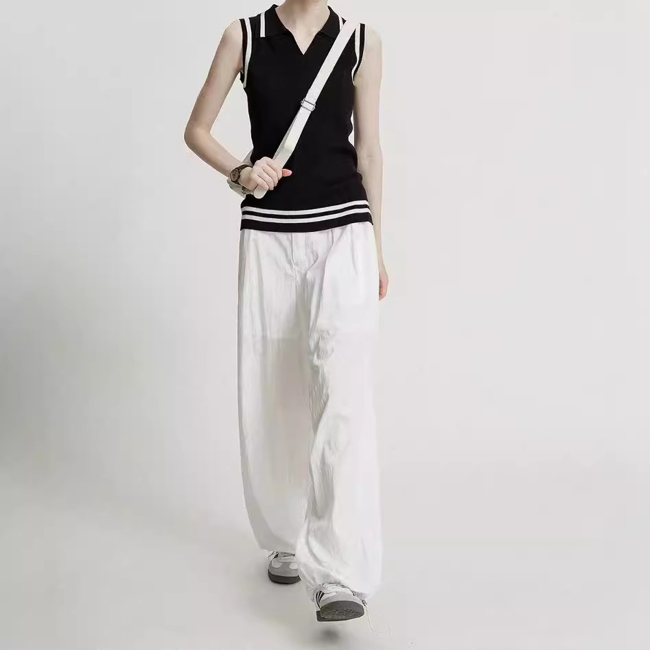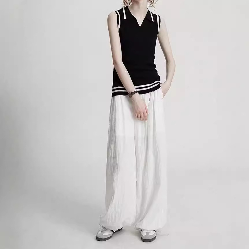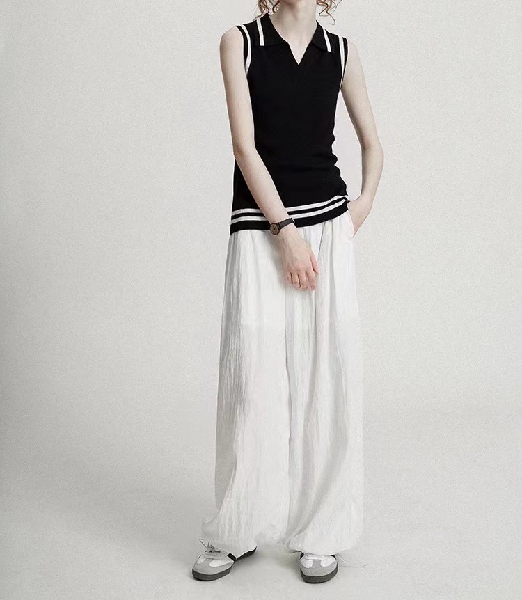 春夏两色针织条纹撞色修身无袖v领翻领弹力背心马甲