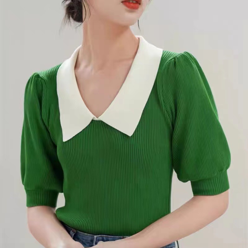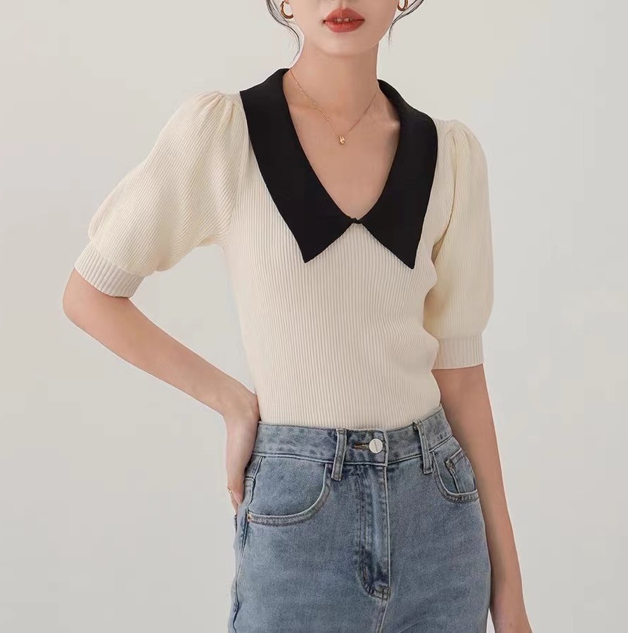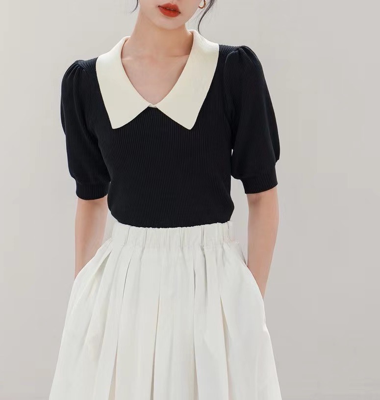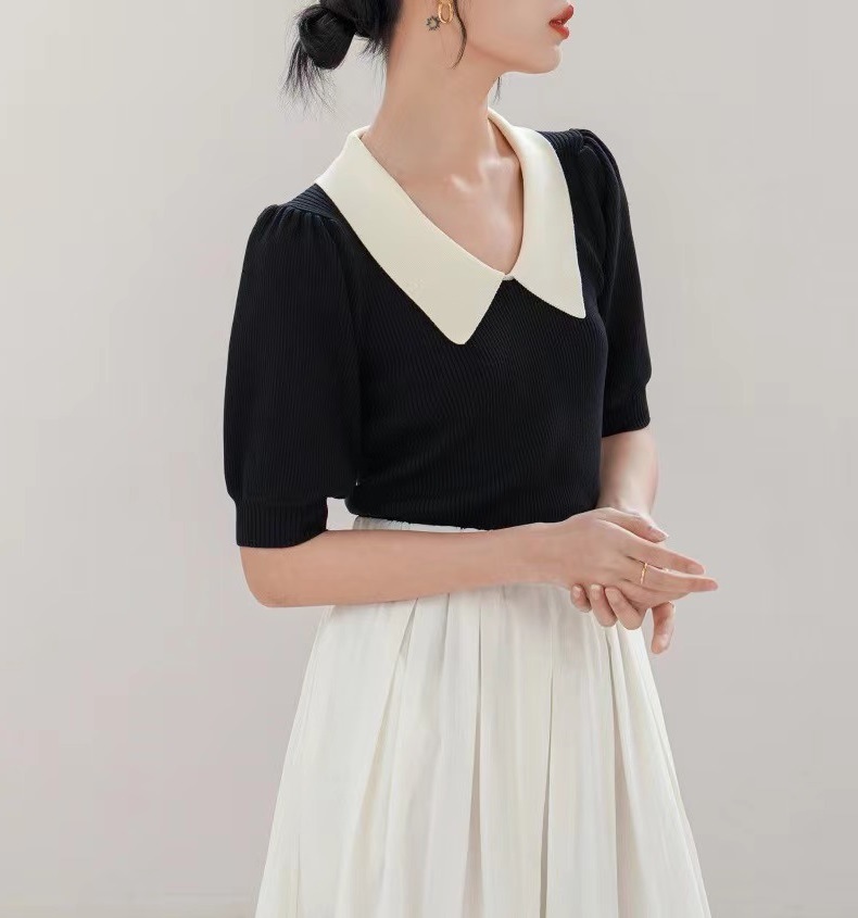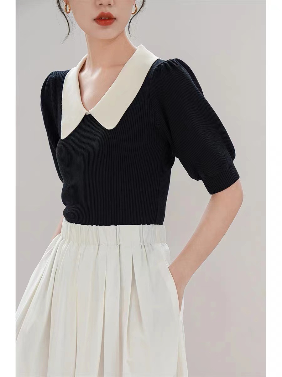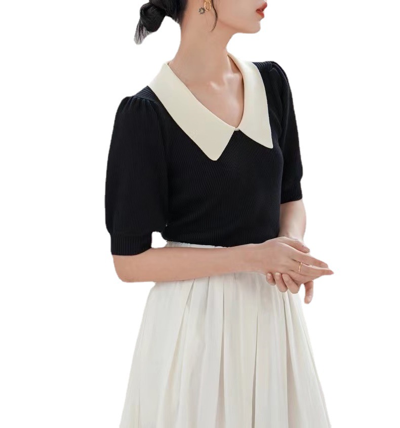 法式娃娃领针织衫女设计感小众冰丝t恤泡泡袖经典黑夏季新款上衣