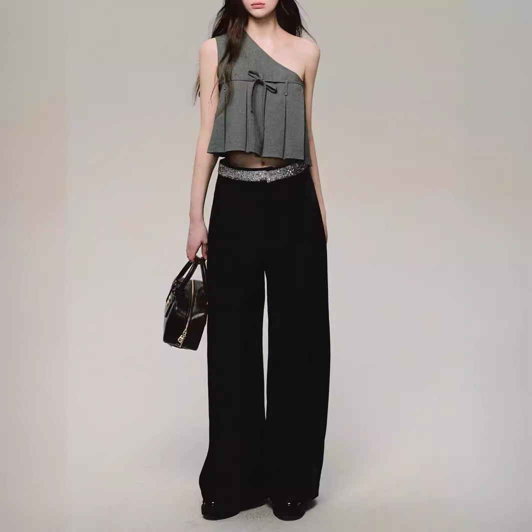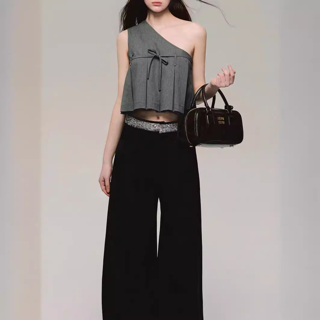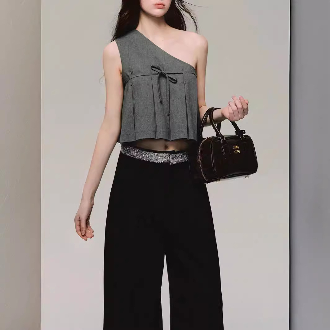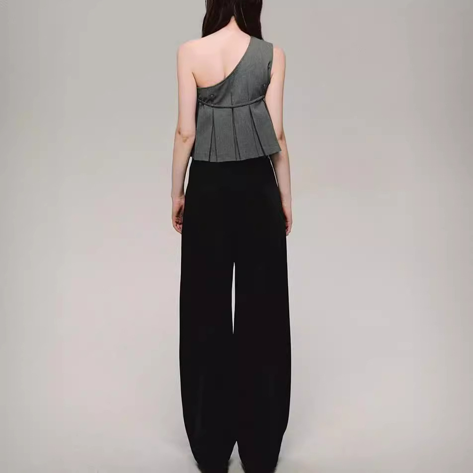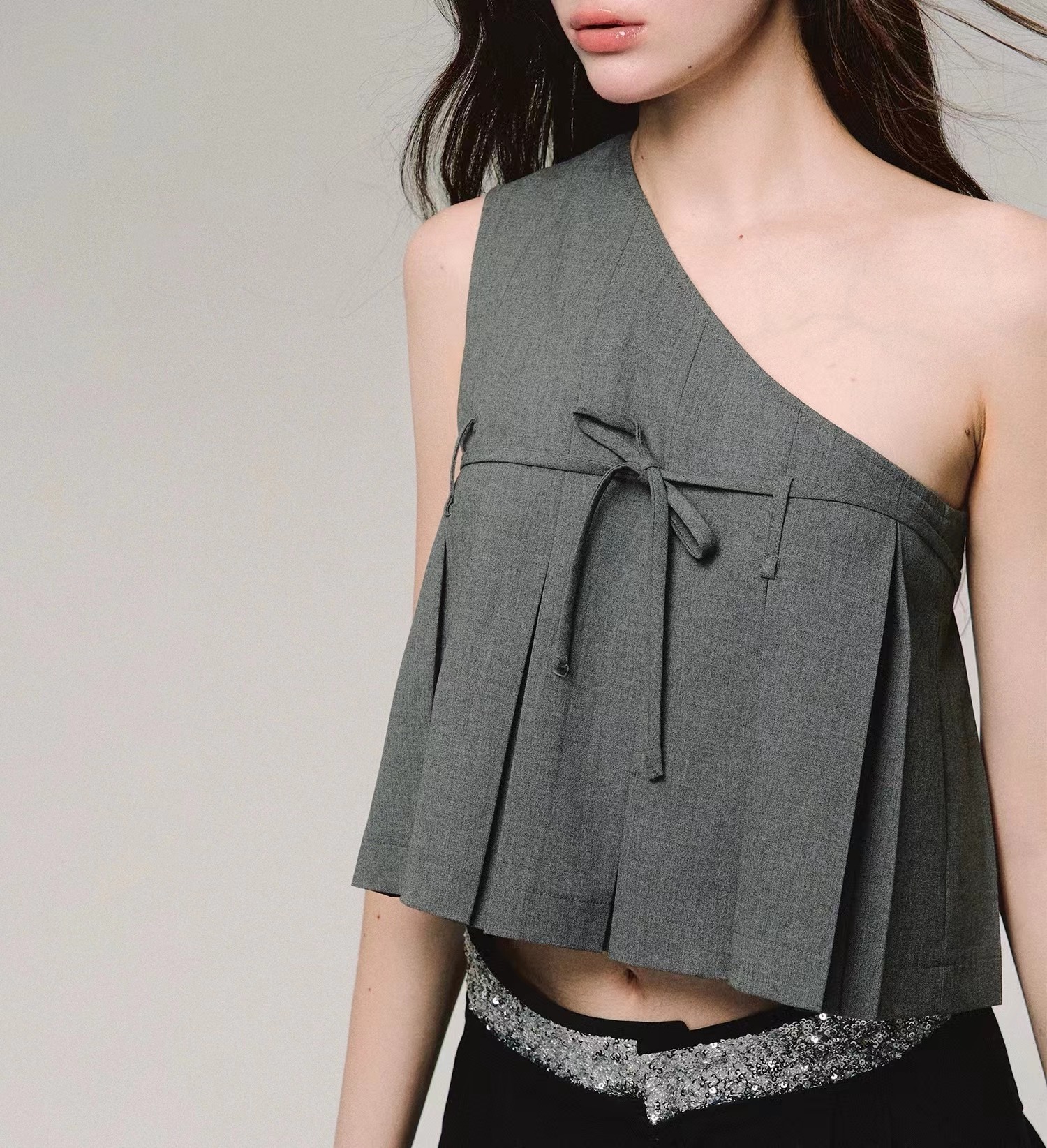 灰色工字褶吊带背心亲肤柔软不对称无袖上衣