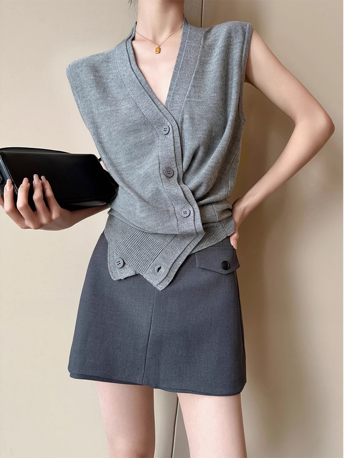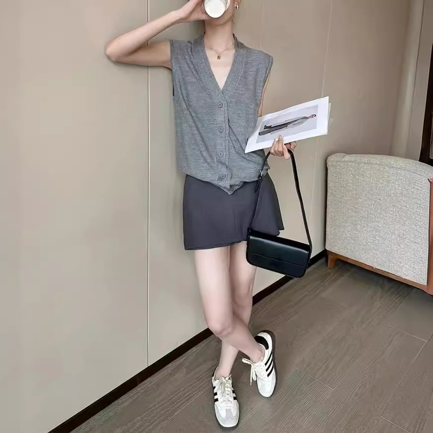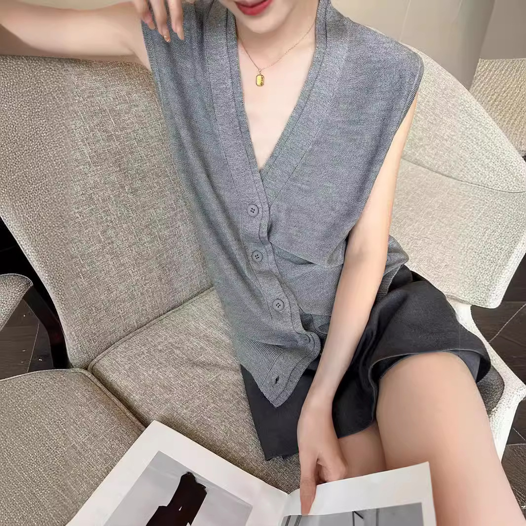 灰色V领无袖针织马甲开衫女夏季新假两件叠穿百搭上衣