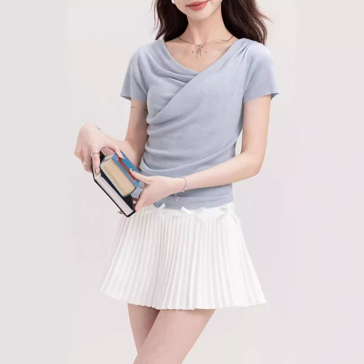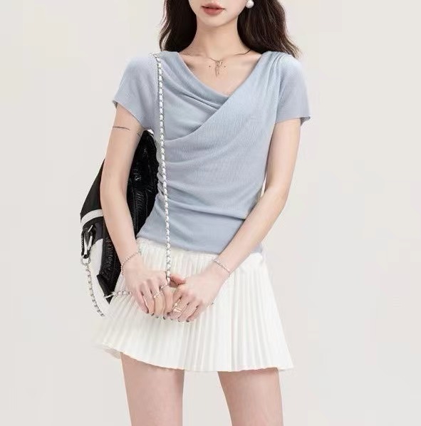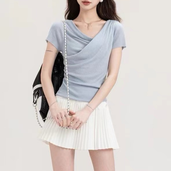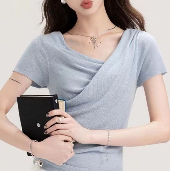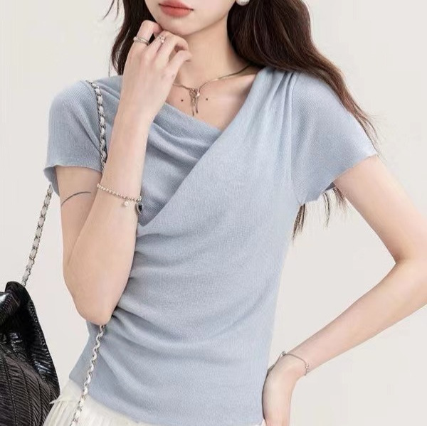 高级感纯色baby蓝荡领T恤女夏季新款不规则时尚修身气质上衣