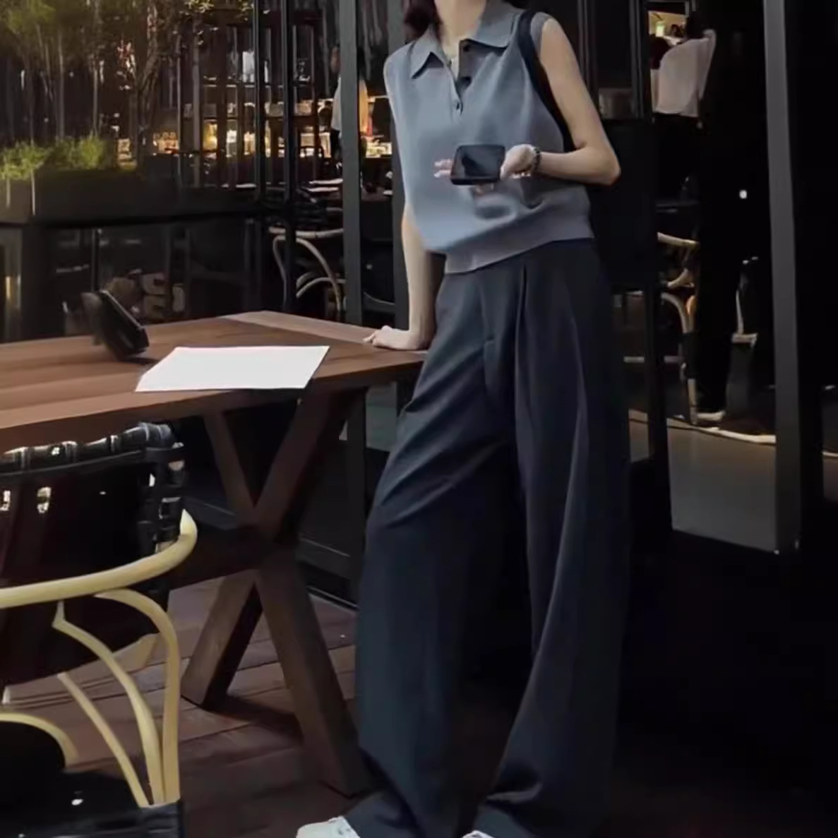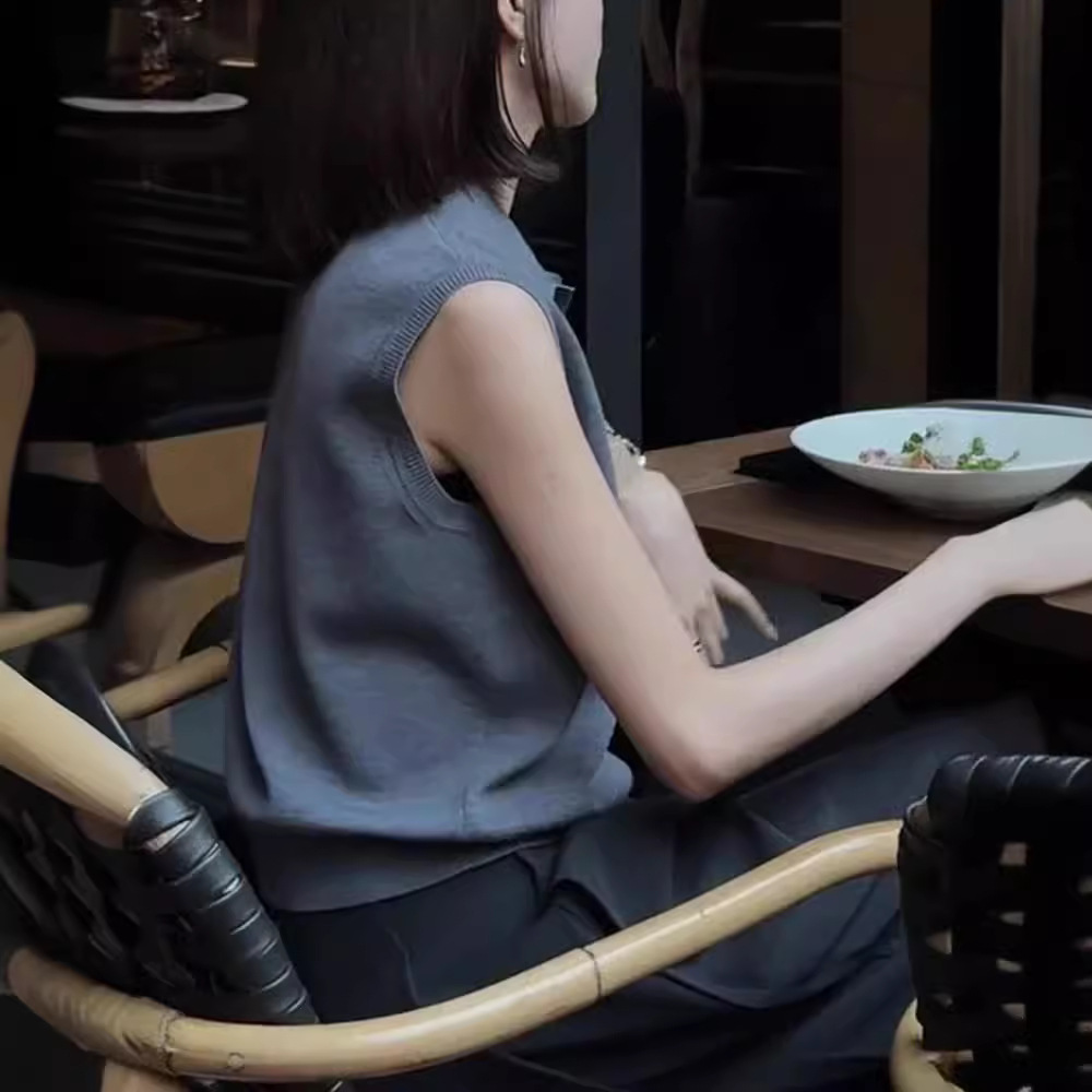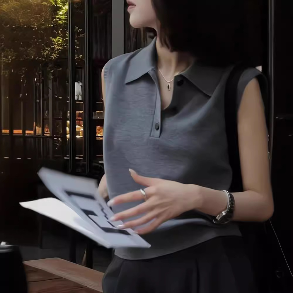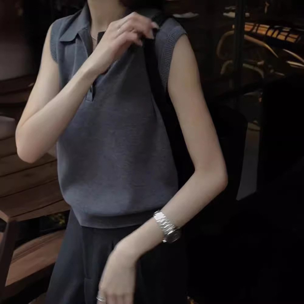 欧货冷淡系夏季上衣气质灰色翻领无袖针织背心女短款显瘦t恤