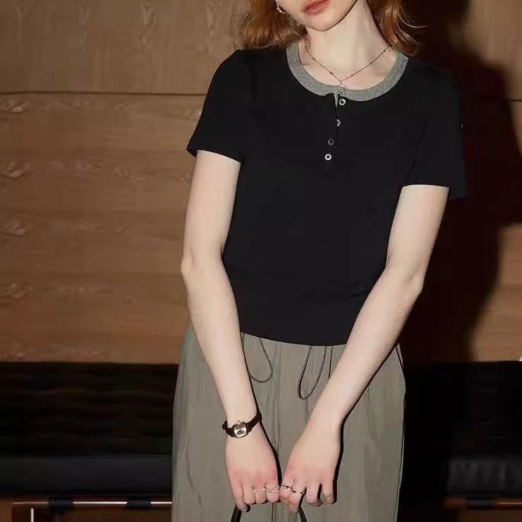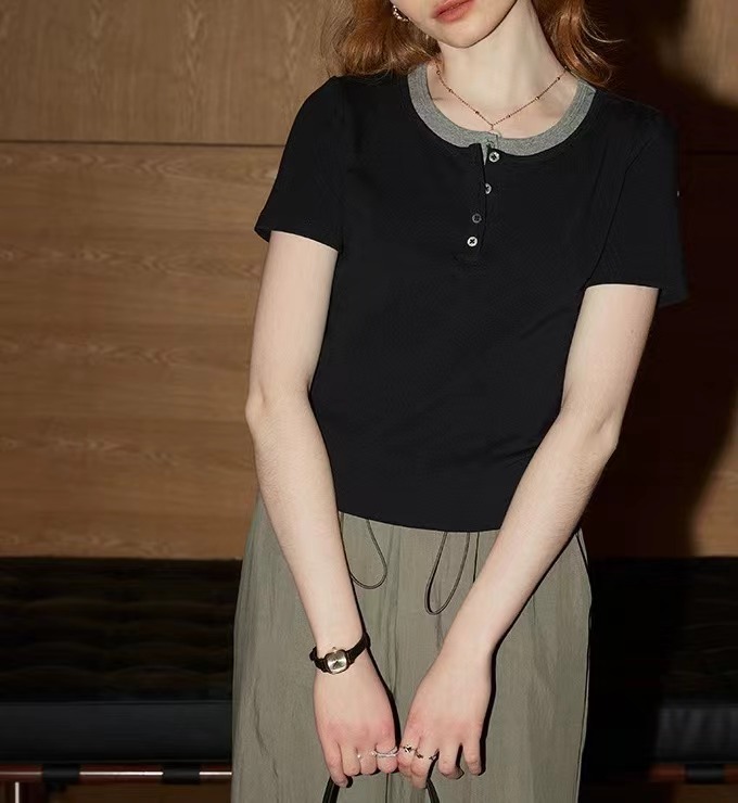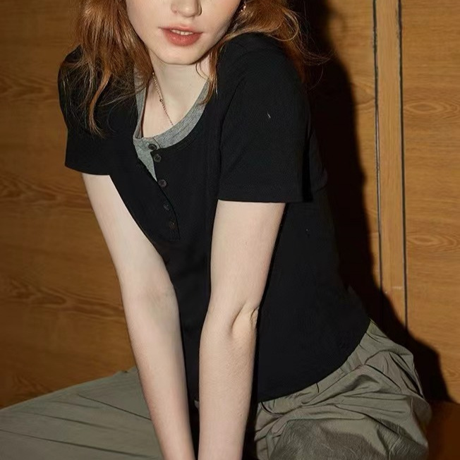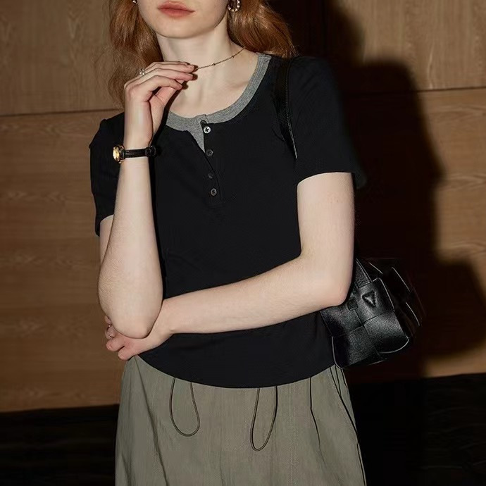 夏季新款假两件小V领短袖T恤女宽松休闲小个子简约别致上衣潮