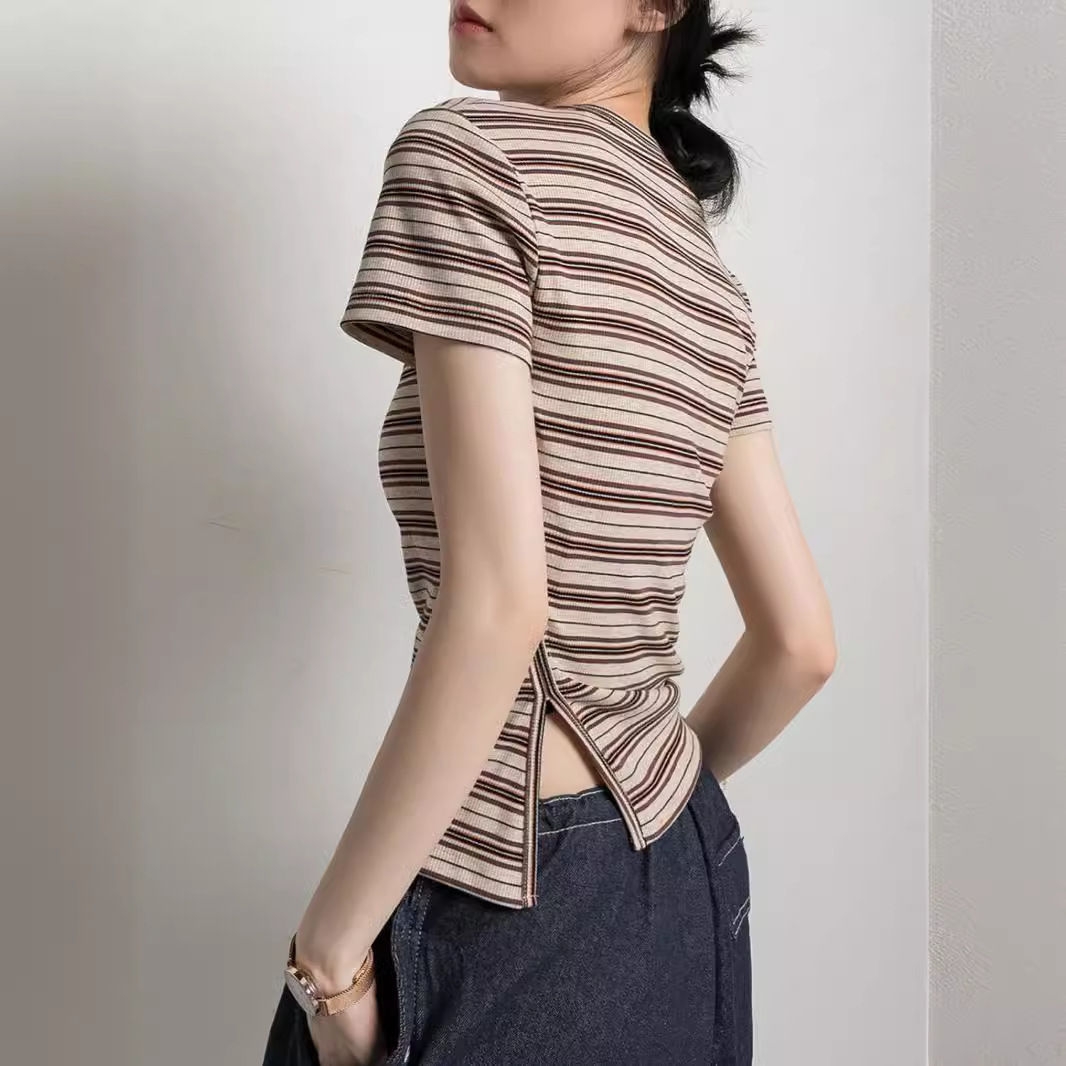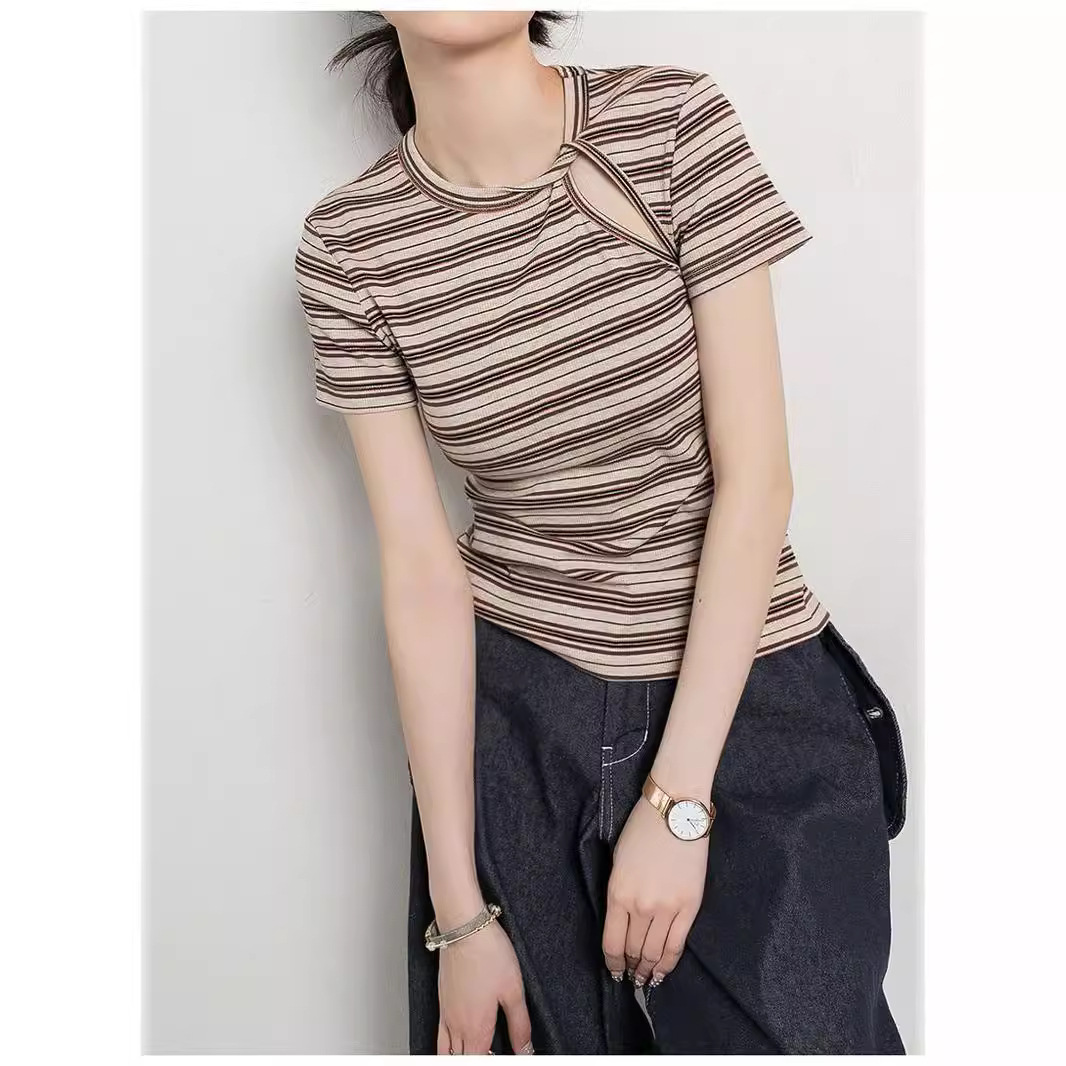 夏季新款小众设计感圆领斜襟开叉镂空条纹薄款高弹短袖t恤女
