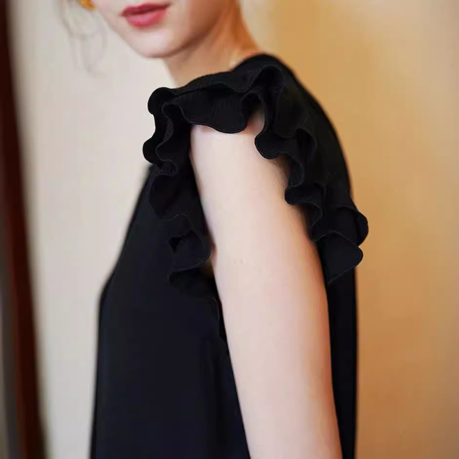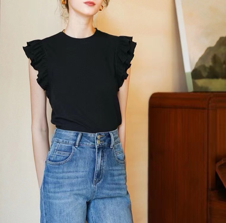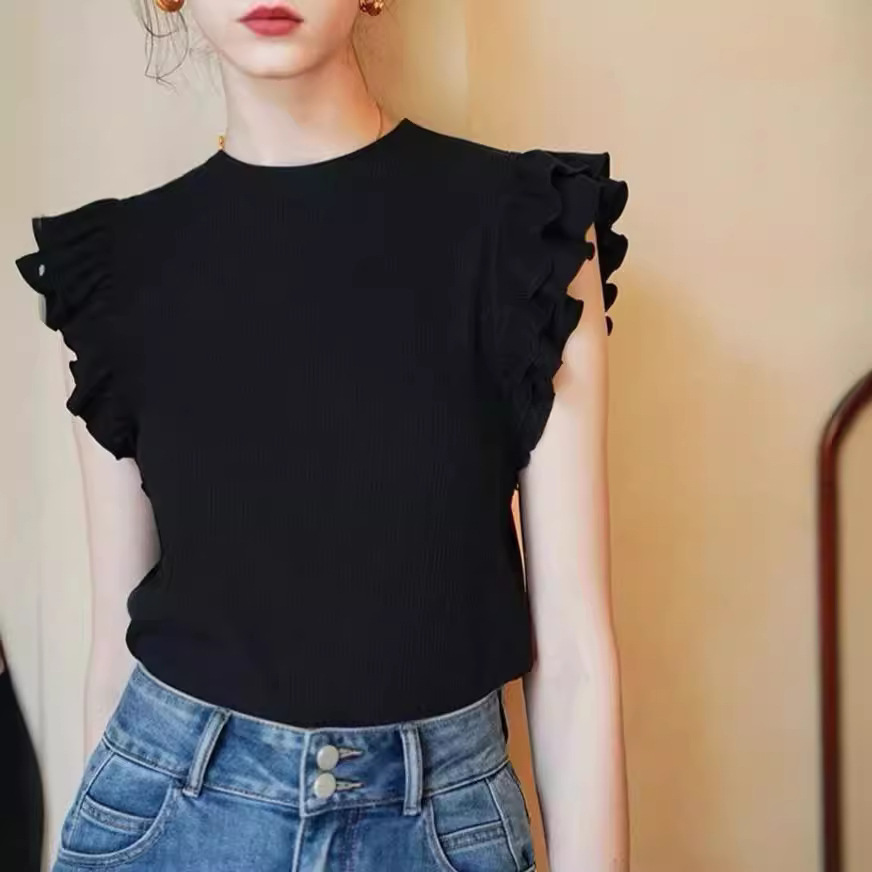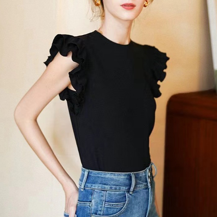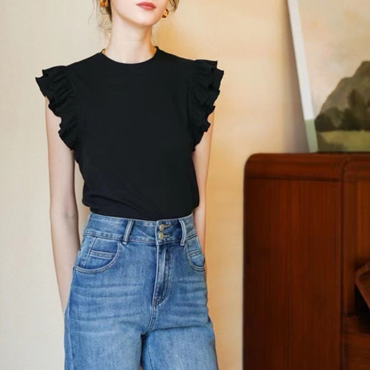 韩版简约木耳边飞飞袖黑色圆领短袖T恤夏季新款上衣女装