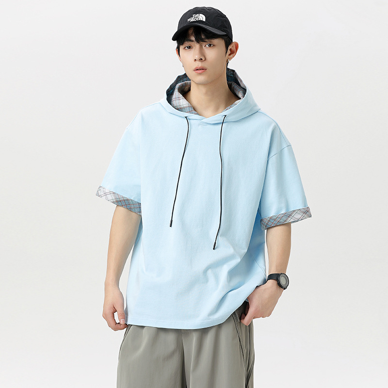 2025年夏季新款男士美式格子撞色拼接连帽假两件短袖T恤男上衣
