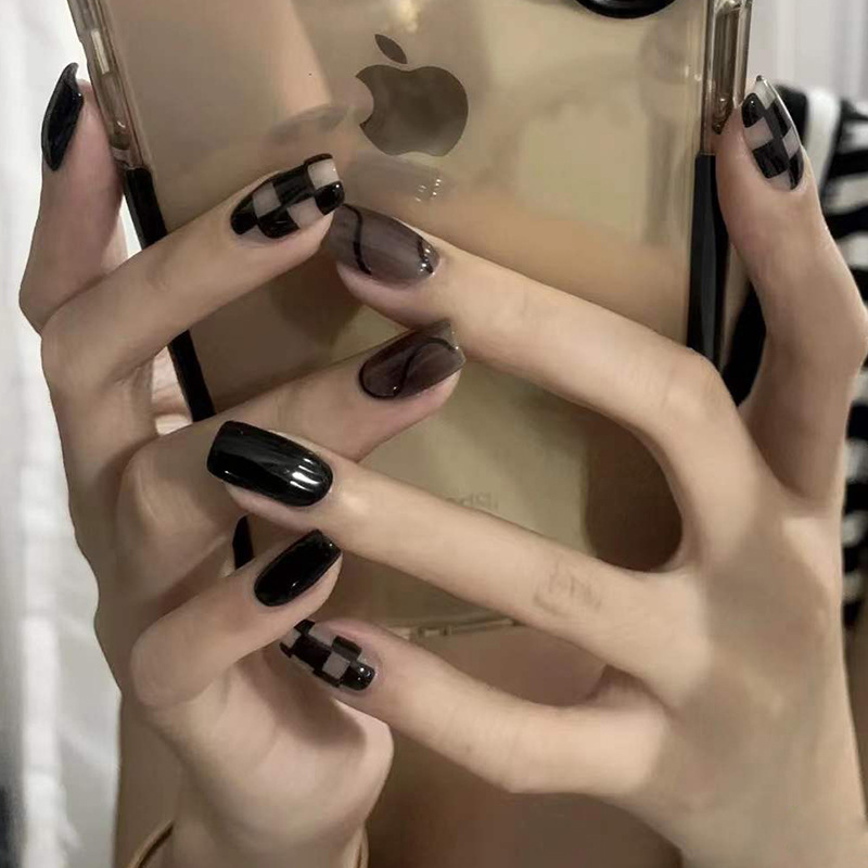 【冷淡黑棋格盘】穿戴甲甲片成品穿戴甲长款穿戴甲可拆卸甲片