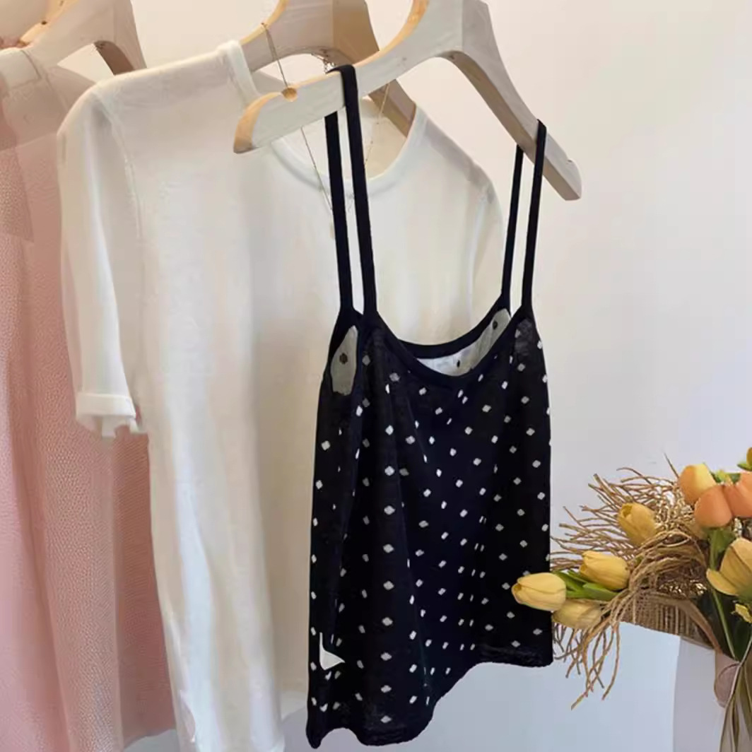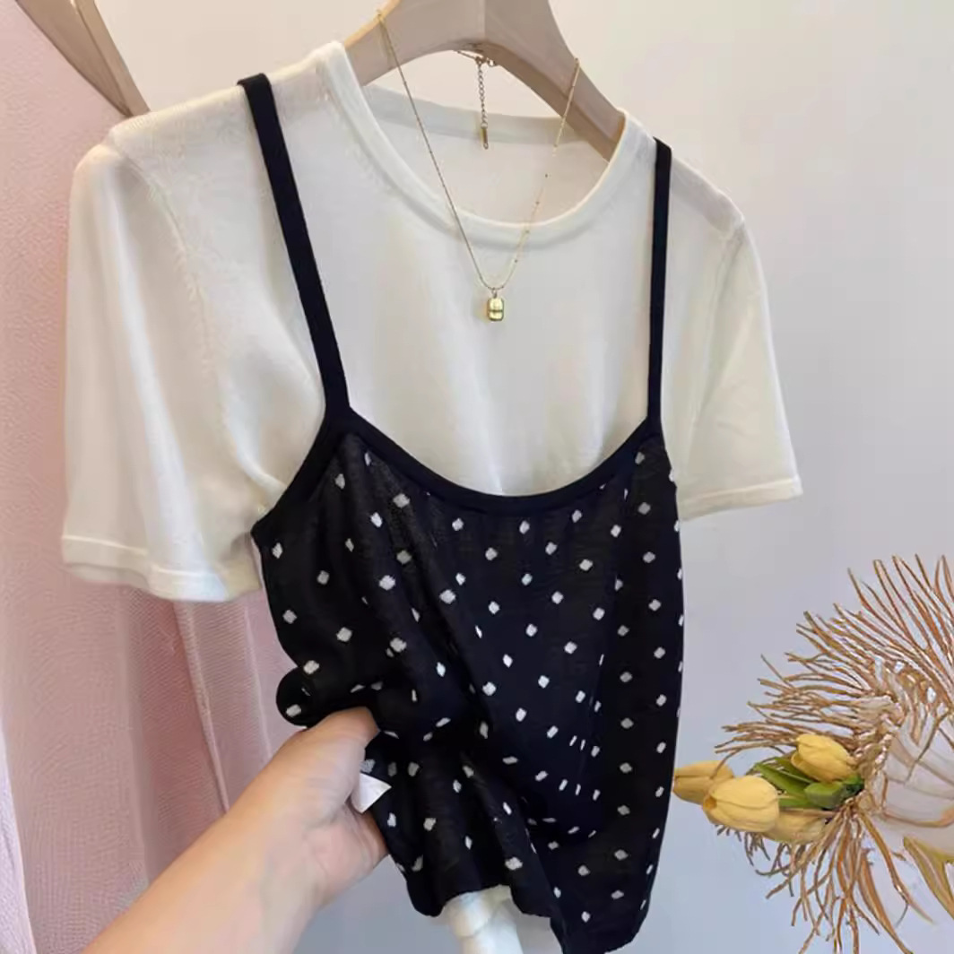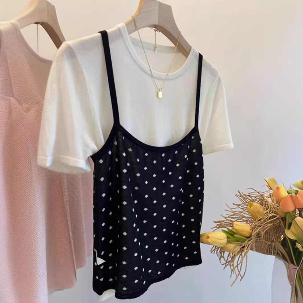 时髦小众设计感圆领针织衫短袖百搭吊带背心女春夏新款两件套