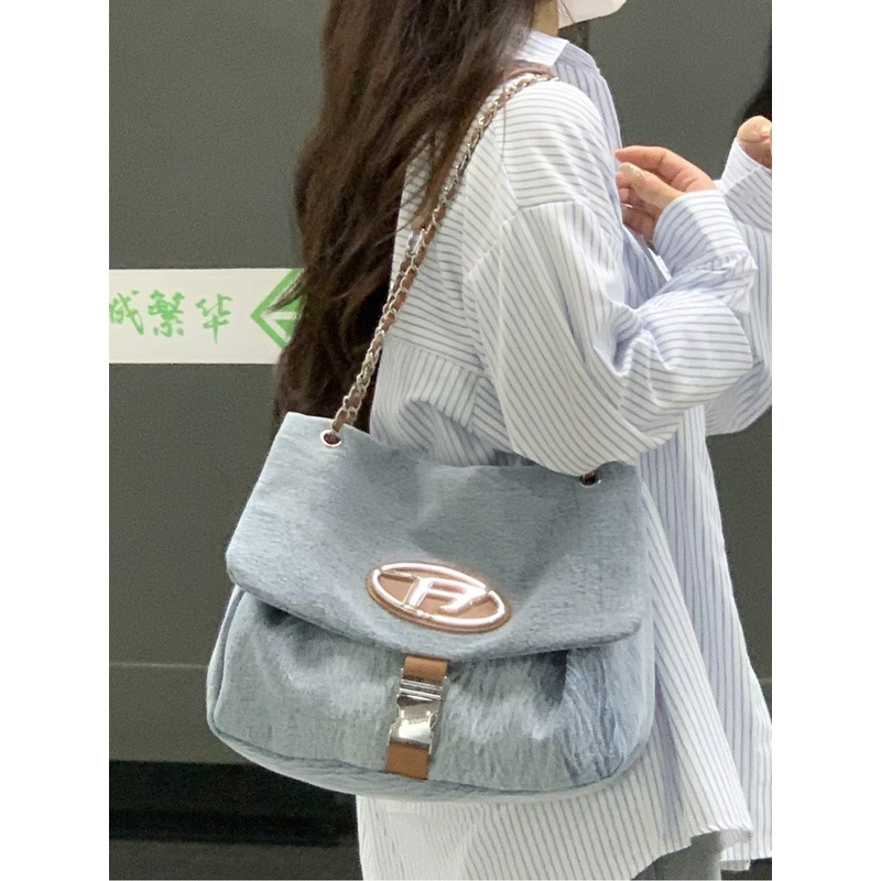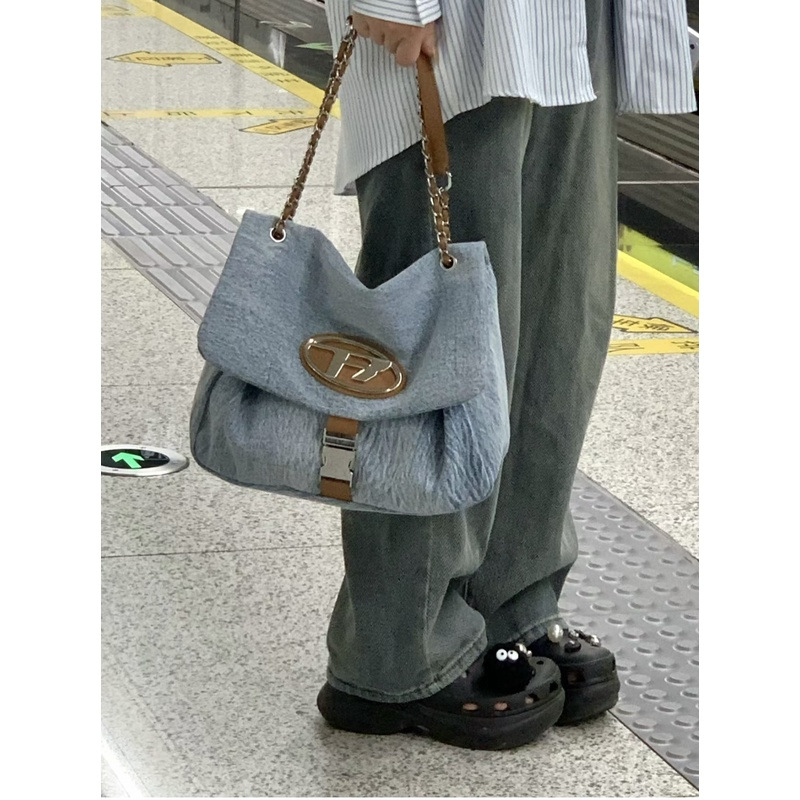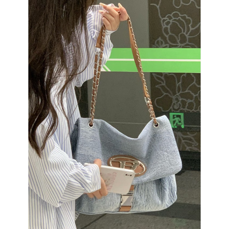 流浪包女新款大容量牛仔布单肩托特包斜挎链条百搭通勤叮当包