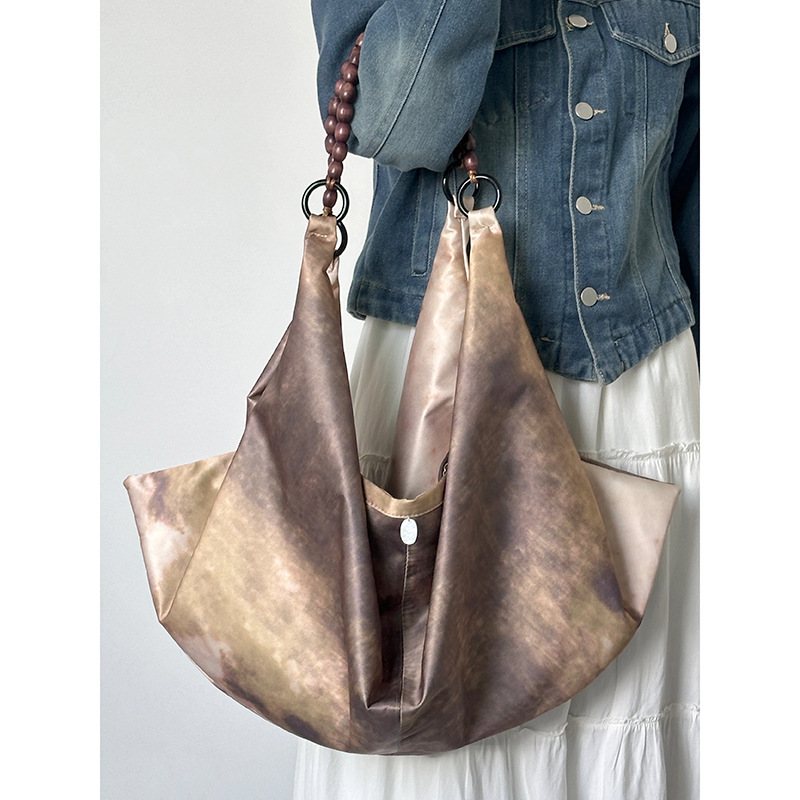 新中式印花饺子包女新款国风百搭大容量设计感木质串珠单肩托特包