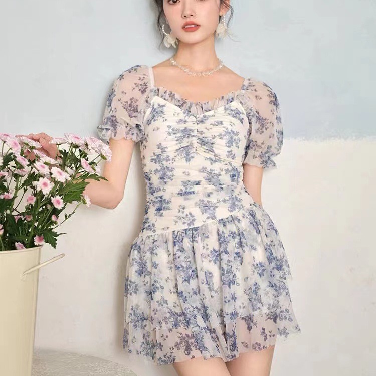 新款连体裙式游泳衣韩国小碎花保守学院风显瘦泡温泉泳装度假