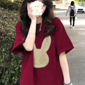 酒红色兔子正肩t恤女短袖夏小众设计感宽松新年本命年半袖上衣服