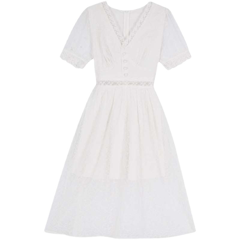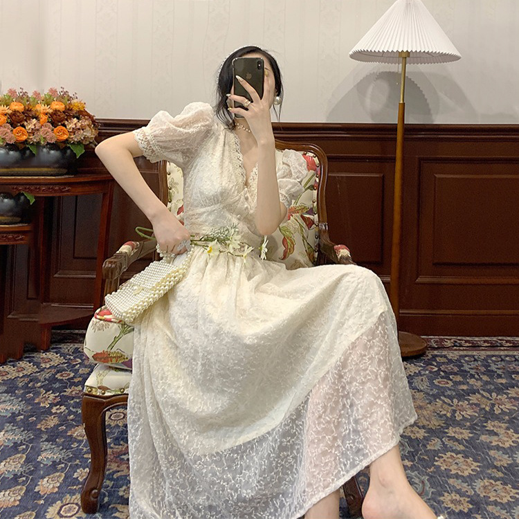 现货夏季新款温柔风v领蕾丝收腰显瘦显高法式气质仙女长款裙
