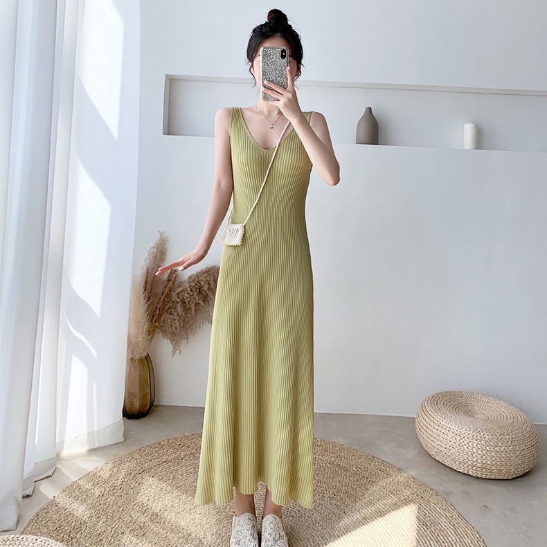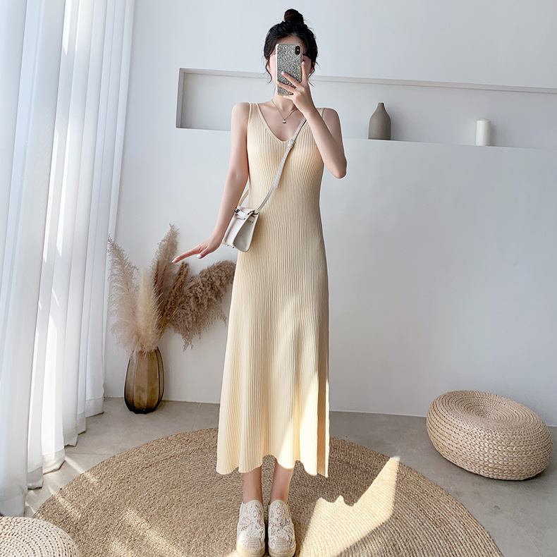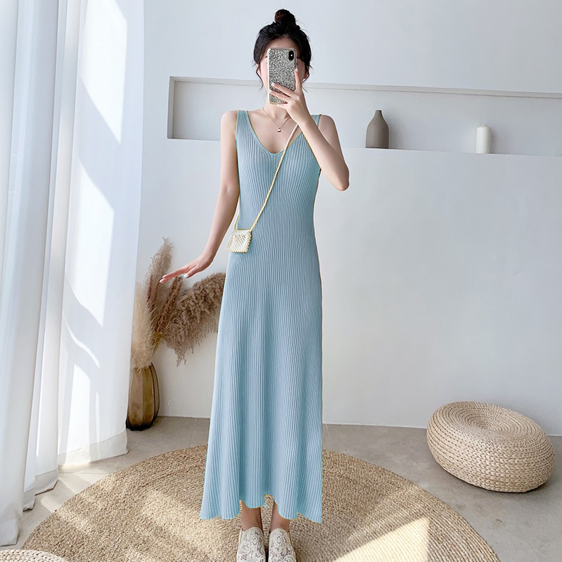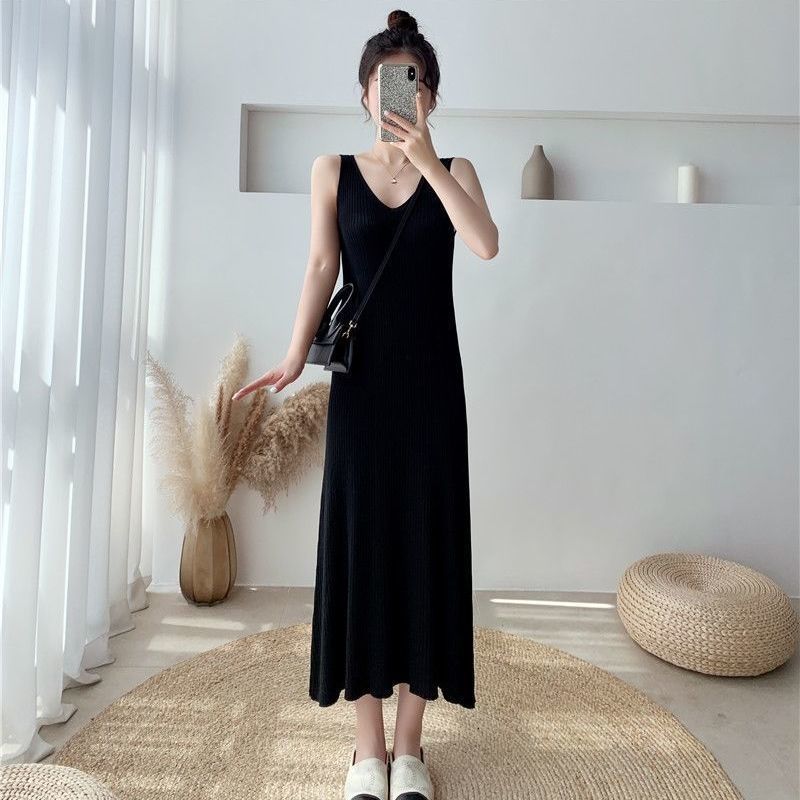 新款夏季冰丝针织吊带连衣裙女薄款内搭中长款无袖开叉背心裙
