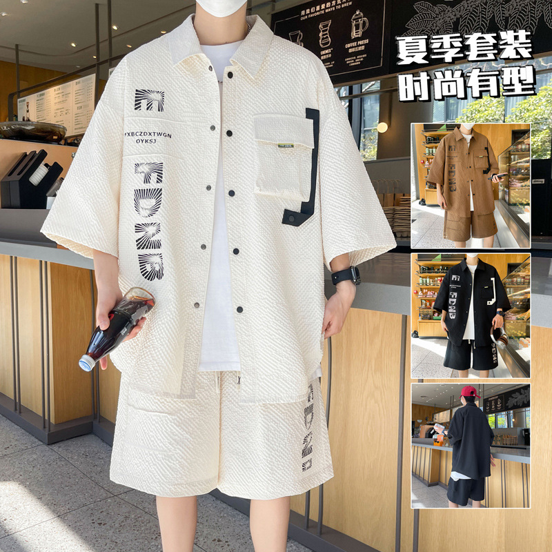 夏短袖衬衫短裤两件套港风运动休闲速干透气防晒衬衣套装