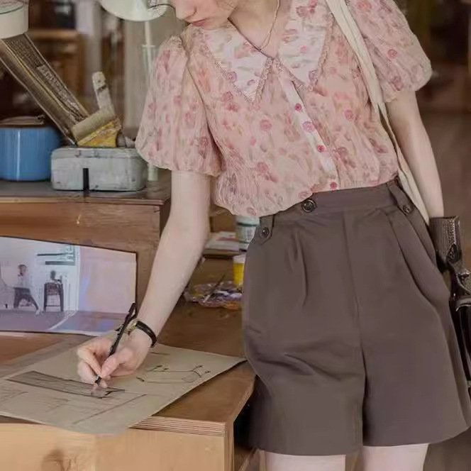轻盈感法式泡泡袖翻领衬衫女上衣