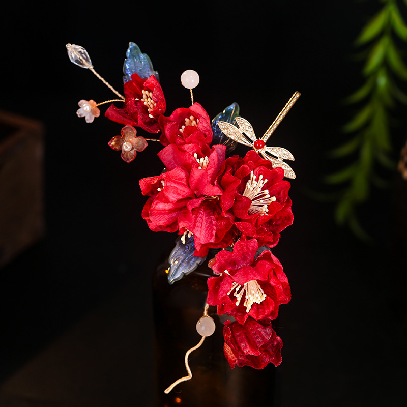 汉服发饰古风红色新娘结婚绢花发夹头饰森系花朵边夹配饰