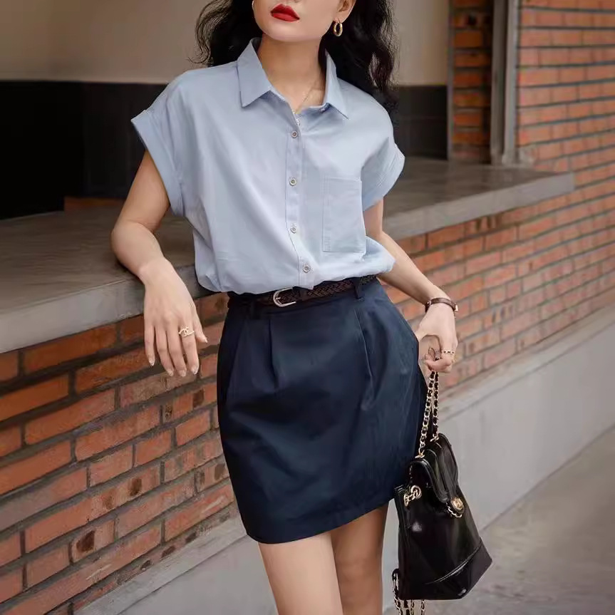 法式设计感小众蓝色小飞袖短袖衬衫女夏简约港风通勤百搭显瘦上衣