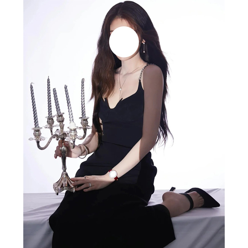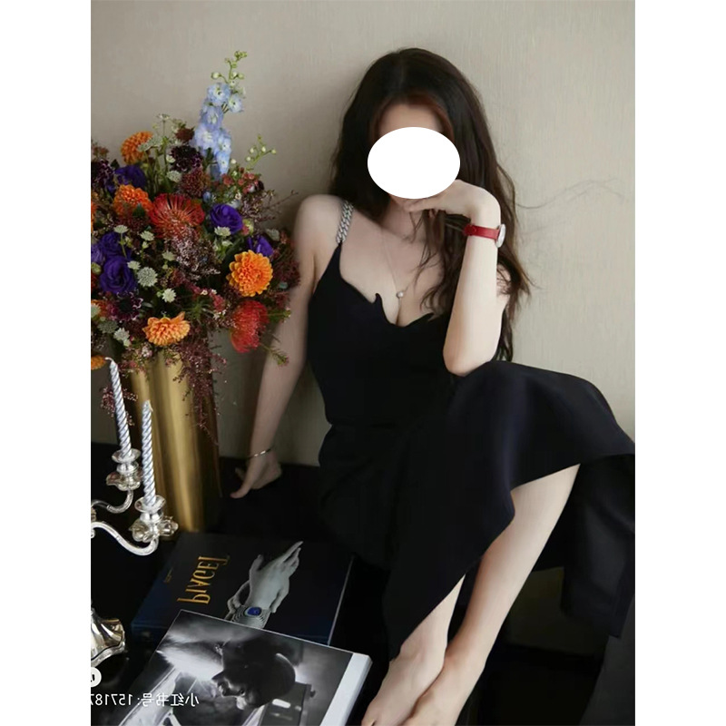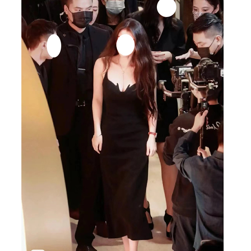 虞书欣同款黑色吊带连衣裙纯欲性感打底裙设计感气质露背礼服长裙