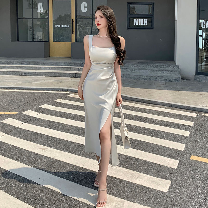 修身气质缎面白色吊带连衣裙夏季法式高级感领证婚礼礼服开叉长裙