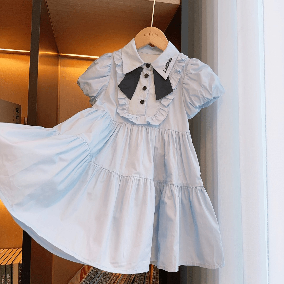 新品女童韩版连衣裙2025夏季新款气质泡泡袖蝴蝶结中小童裙子