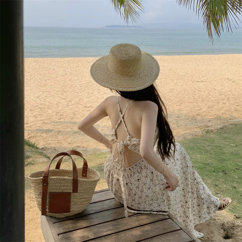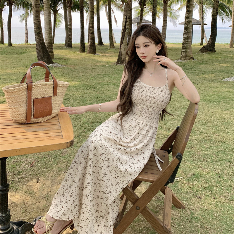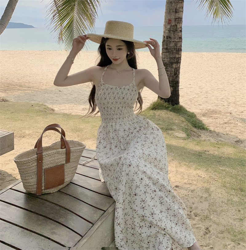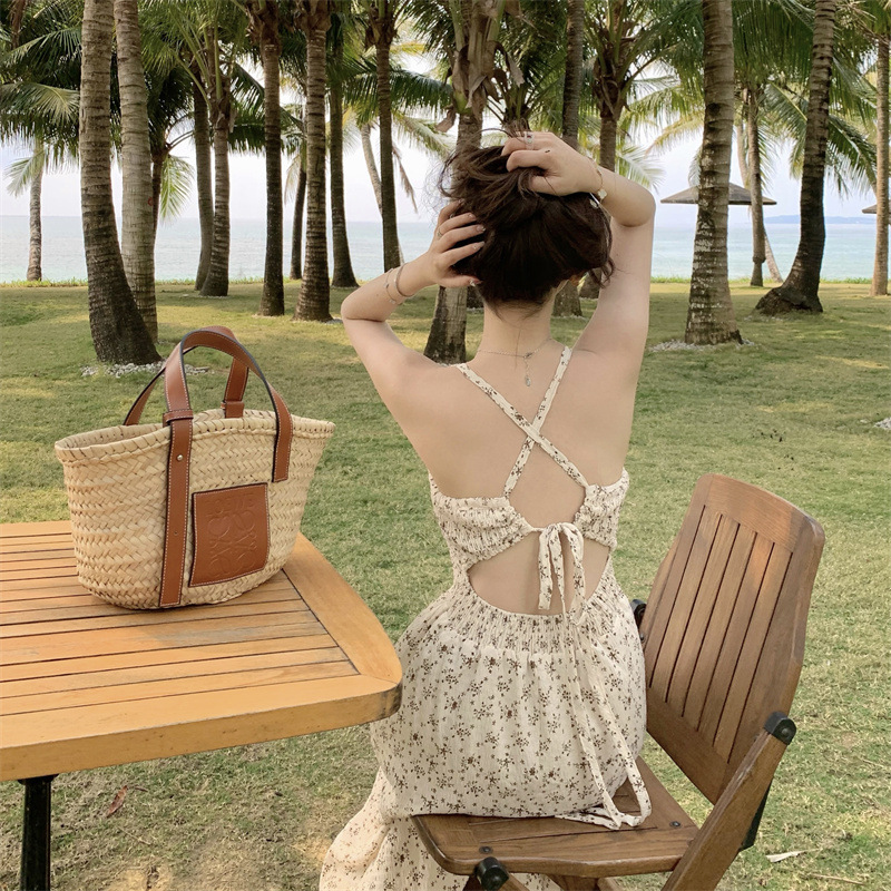 夏季女装新款法式复古碎花吊带连衣裙气质显瘦露背海边度假长裙子