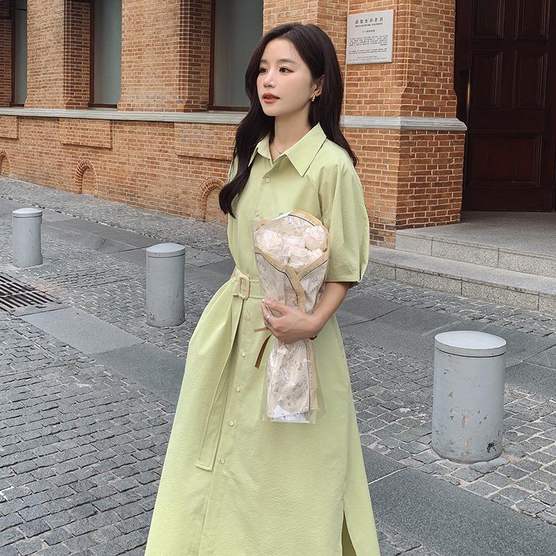 实拍polo领单排扣牛油果绿休闲风收腰显瘦下摆开衩露背连衣裙