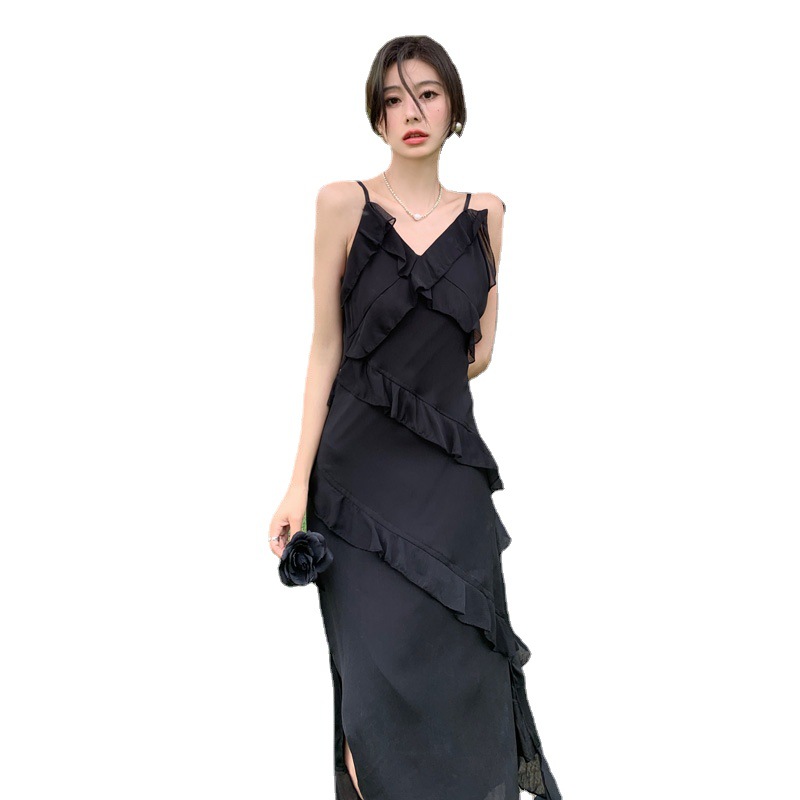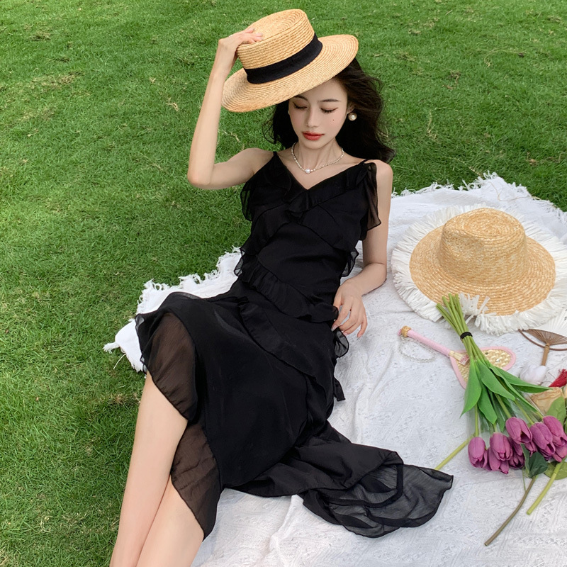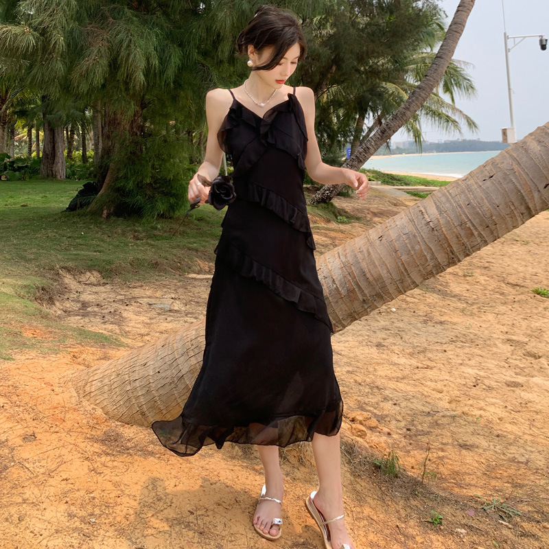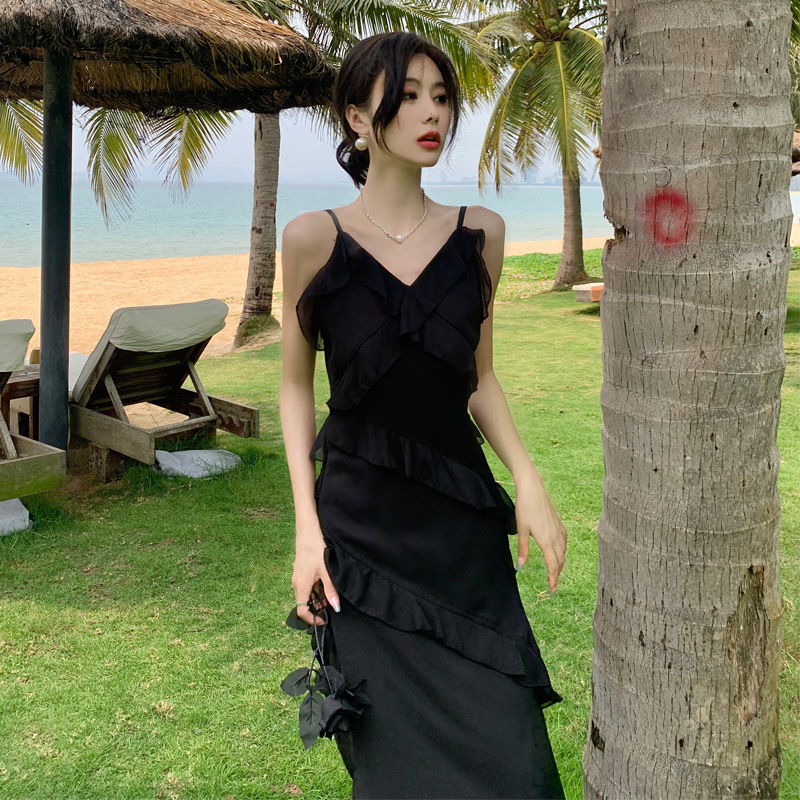 法式黑色荷叶边吊带连衣裙女夏季海边度假甜辣风小个子气质长裙子