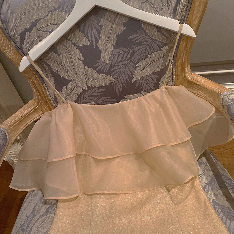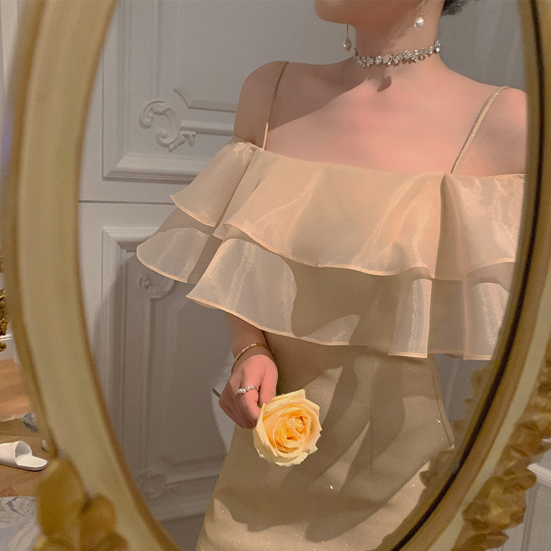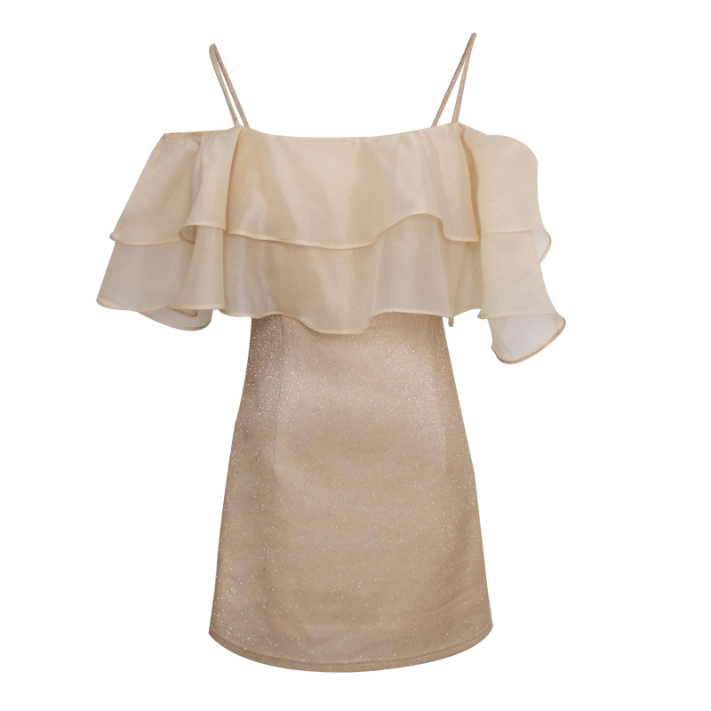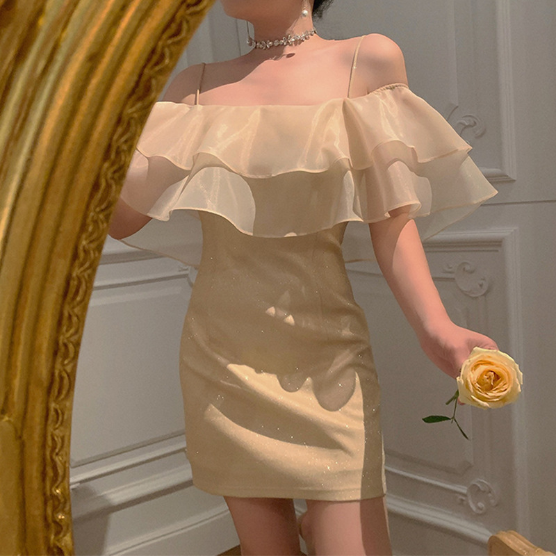 泰版香槟女神 荷叶边吊带银河闪闪连衣裙气质一字肩收腰包臀短裙
