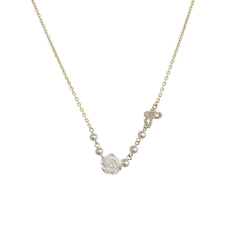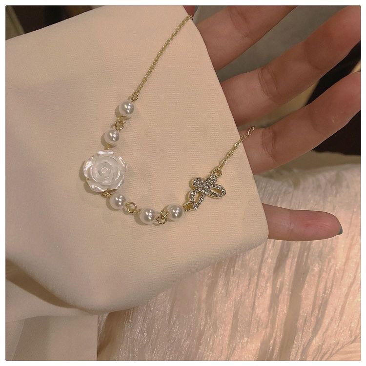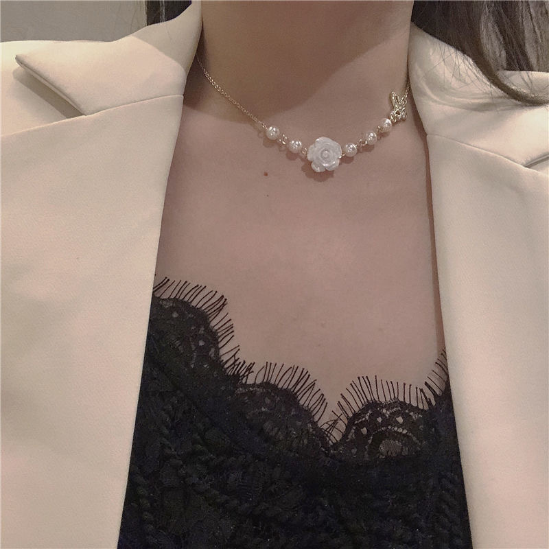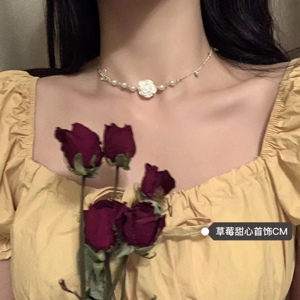 复古法式白玫瑰花项链女ins小众设计感轻奢蝴蝶结锁骨链颈链配饰