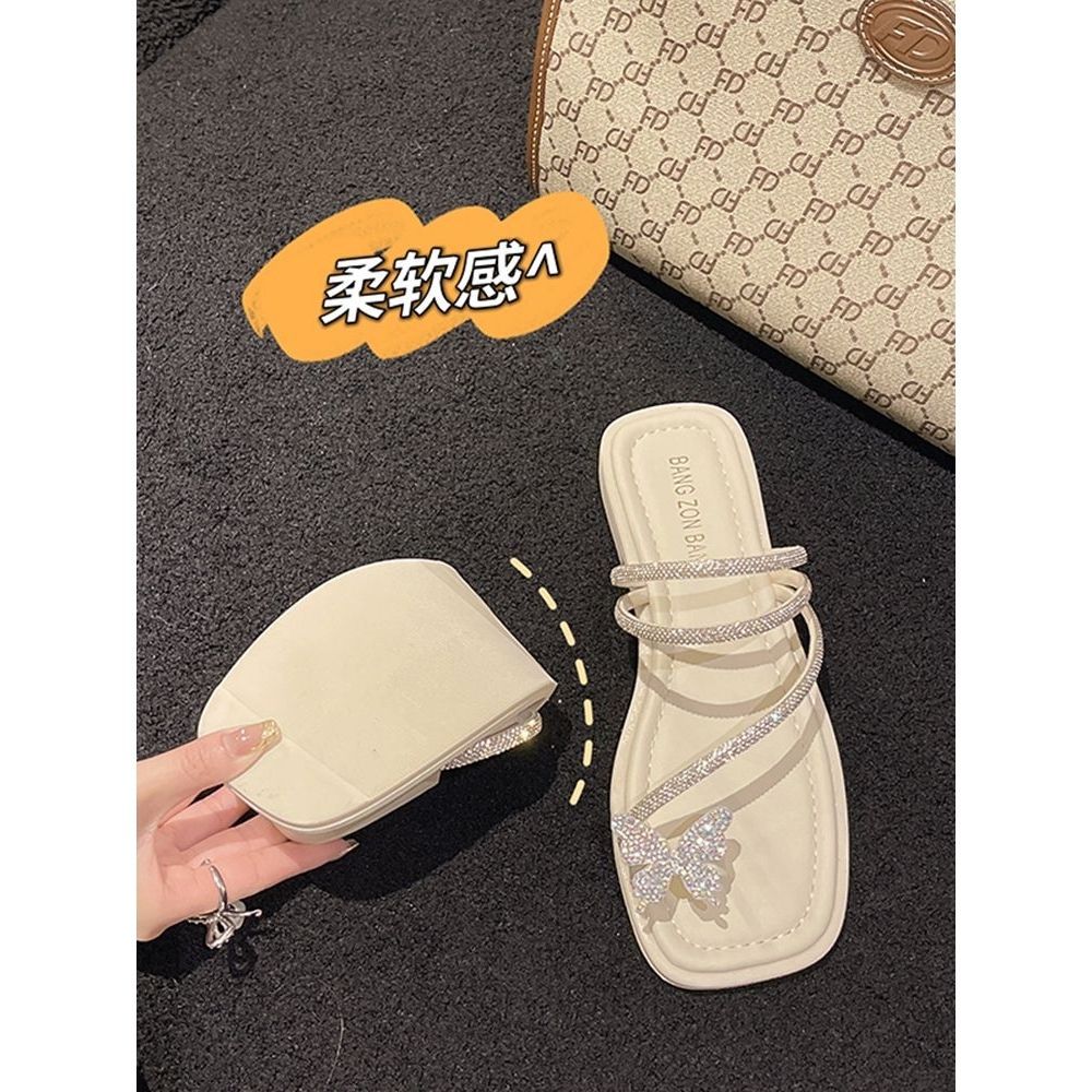 夏季新款ins韩版蝴蝶结凉鞋女平底仙女水钻夹趾凉拖鞋女外穿