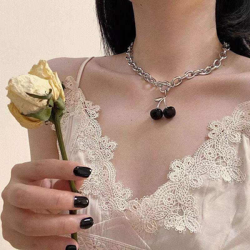 甜酷黑樱桃项链女ins小众设计感毛衣链百搭嘻哈风辣妹锁骨链颈链