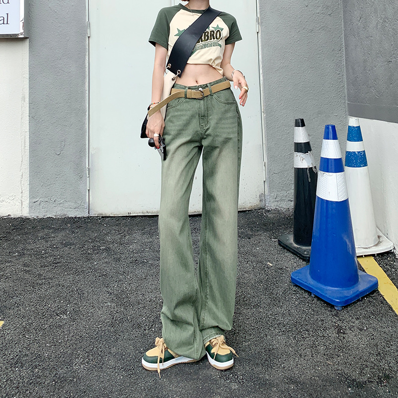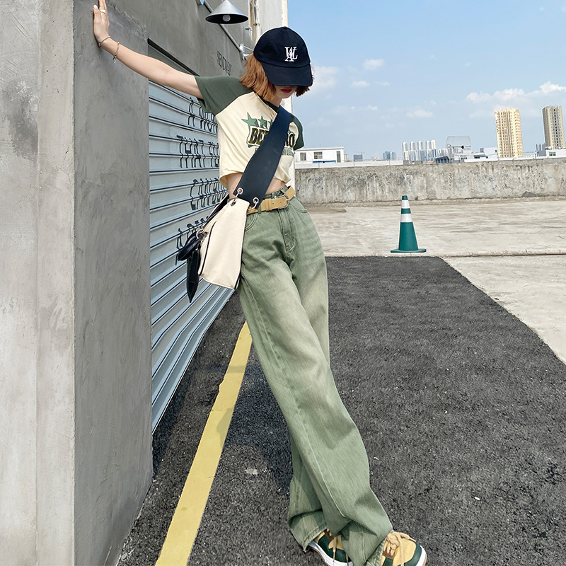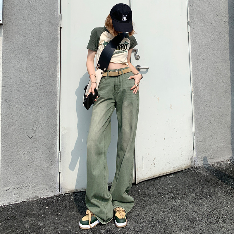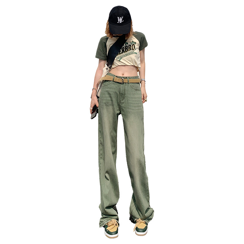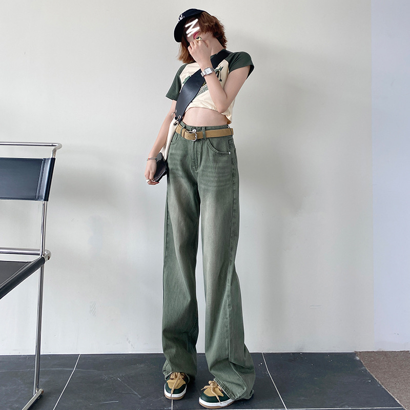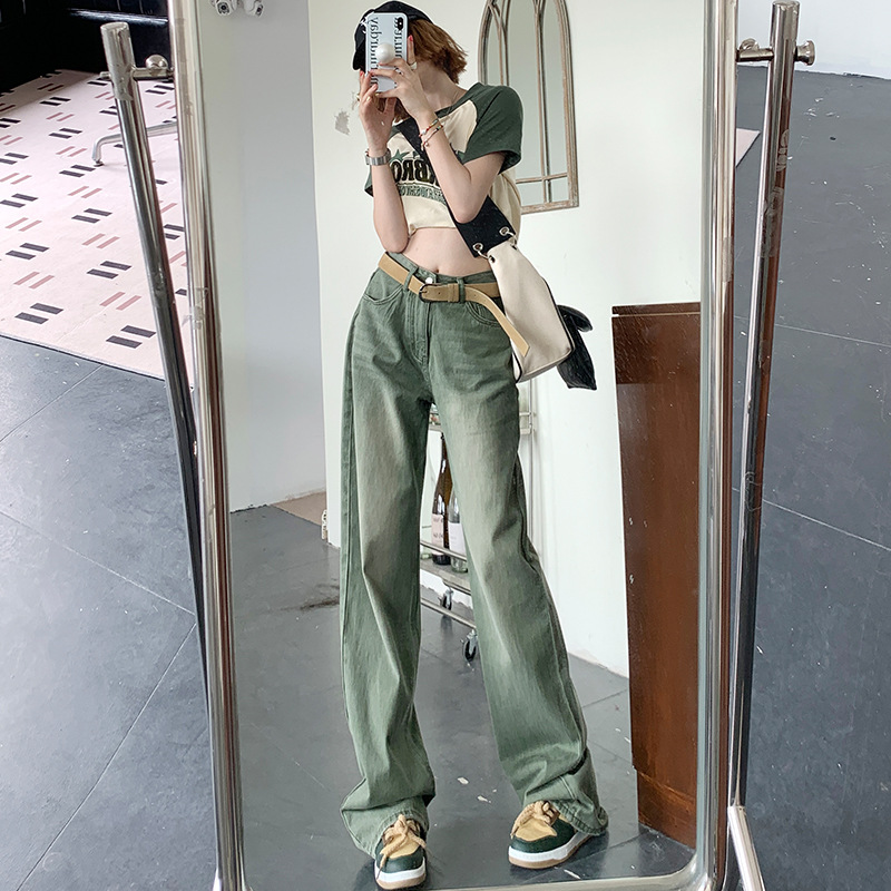 狸舍#水洗绿女装牛仔裤宽松高腰显瘦美式甜酷高个子阔腿拖地裤女
