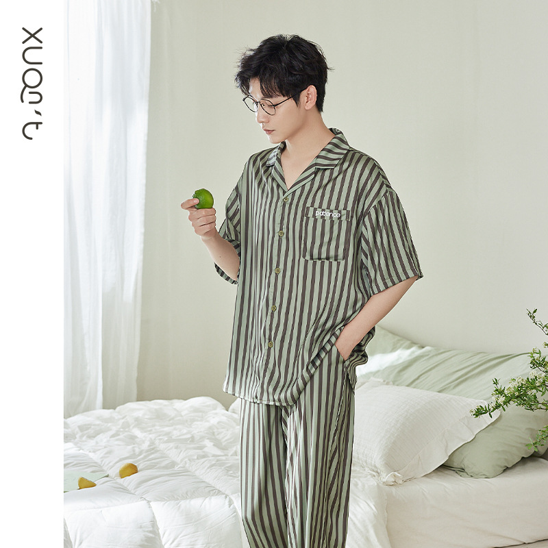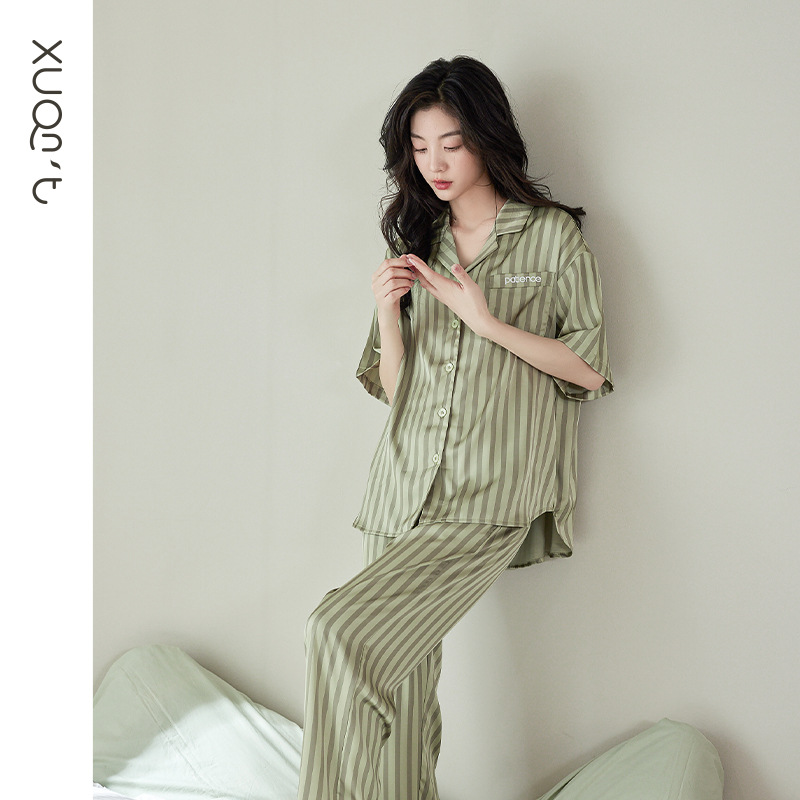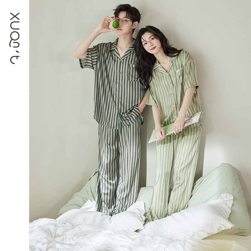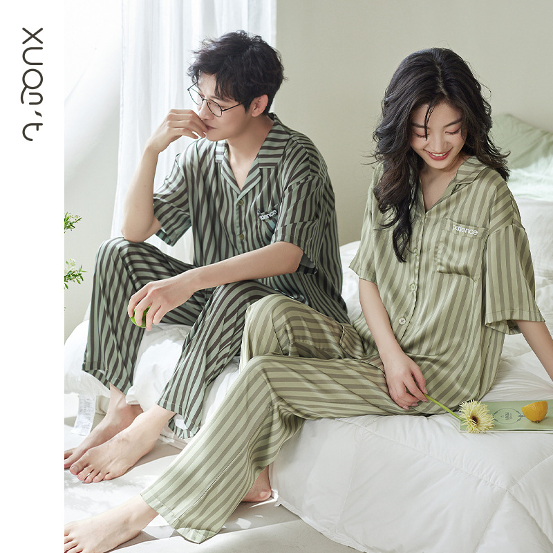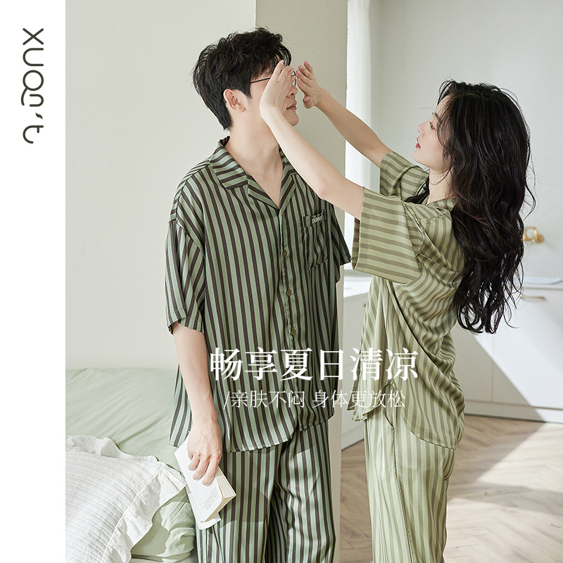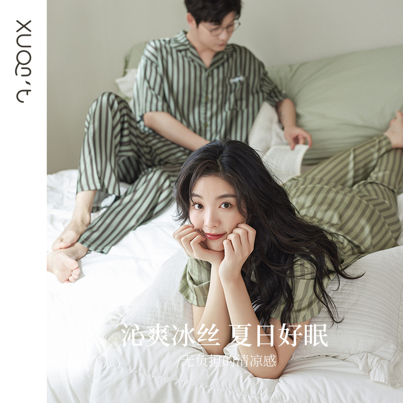 【凉感型】情侣睡衣夏季冰丝时尚高级感条纹短袖长裤女家居服男士