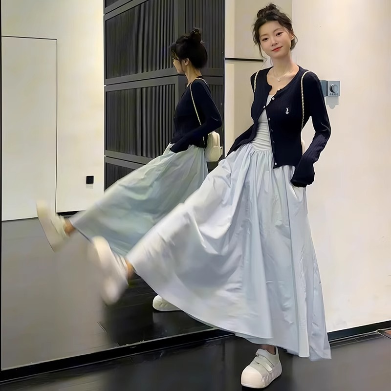 蓝色吊带连衣裙女夏季2025新款收腰显瘦a字伞裙高级感韩系大摆裙