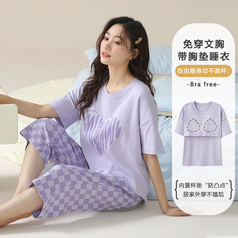 带胸垫一体睡衣女士夏季薄款纯棉短袖七分裤外穿全棉家居服套装