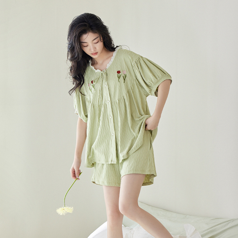 【凉感型】夏天睡衣女新款纯棉短袖薄款清新绿色家居服两件套