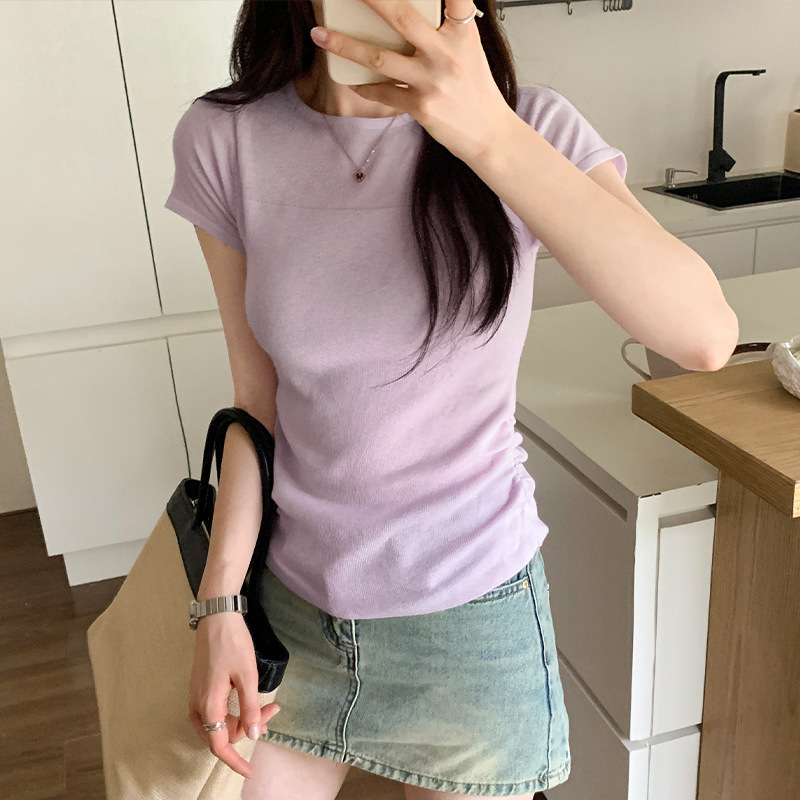 韩系气质纯欲收腰抽褶拼接薄款短袖针织T恤夏季新款修身上衣