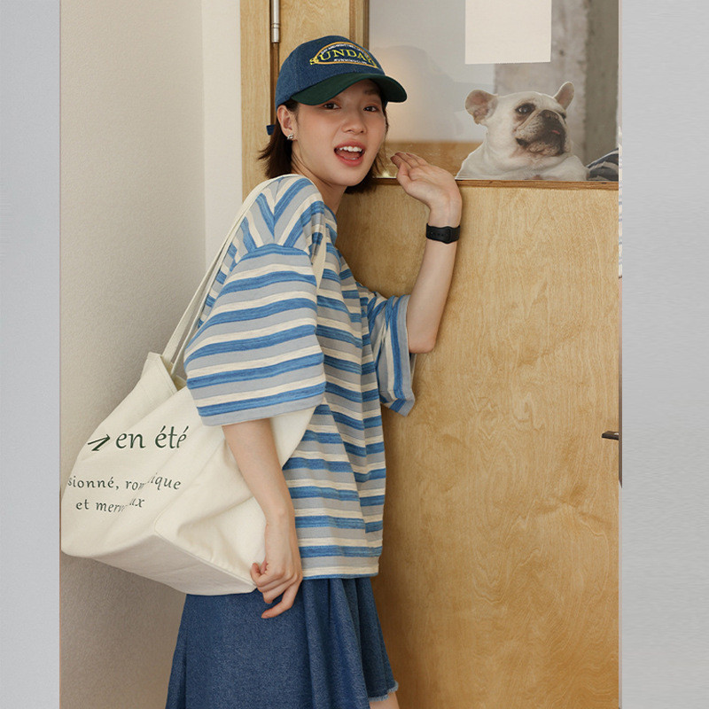夏季新款宽松竹节棉夏日感撞色条纹短袖t恤女【盛夏时光】t2407