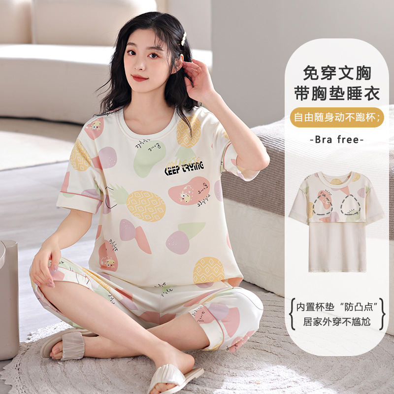 带胸垫睡衣女夏季纯棉短袖七分裤少女生卡通可爱家居服新款
